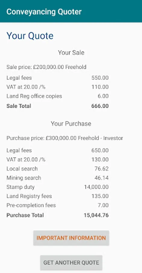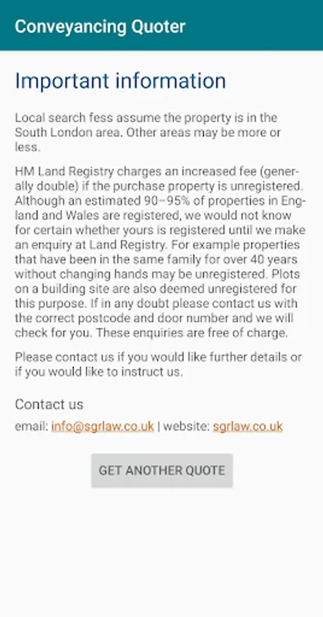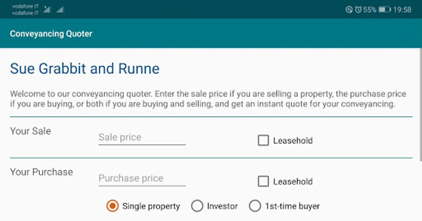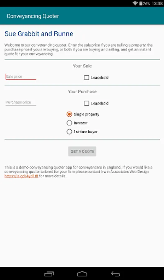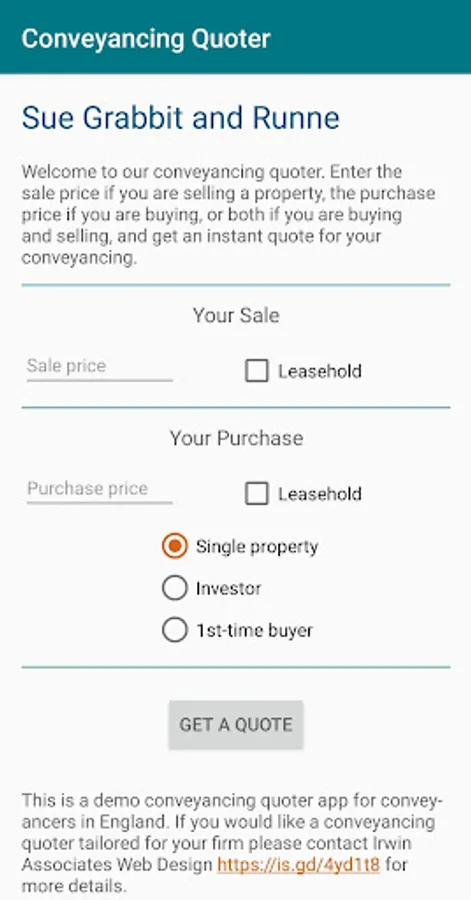 This app is a demonstration of a conveyancing quoter that can be tailored to the needs of individuals or firms who undertake conveyancing work in England and Wales