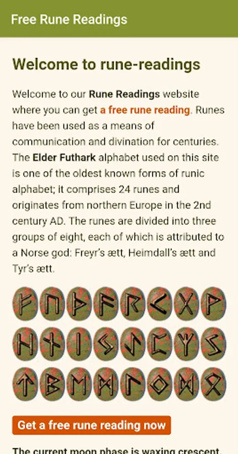 Rune Readings: free online rune readings using the elder futhark runic alphabet; single rune reading (odin's rune) and three rune reading (three nons).