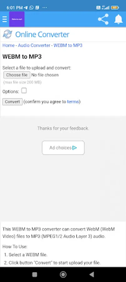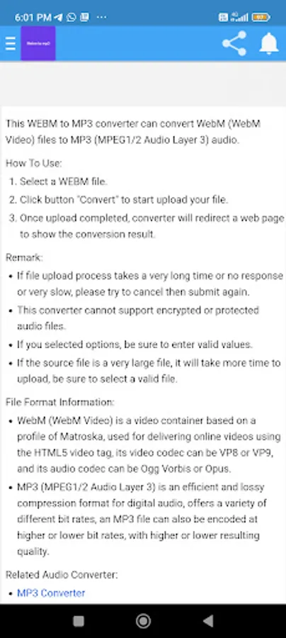 This WEBM to MP3 converter can convert WebM (WebM Video) files to MP3 (MPEG1/2 Audio Layer 3) audio.