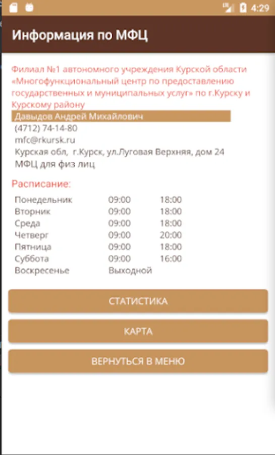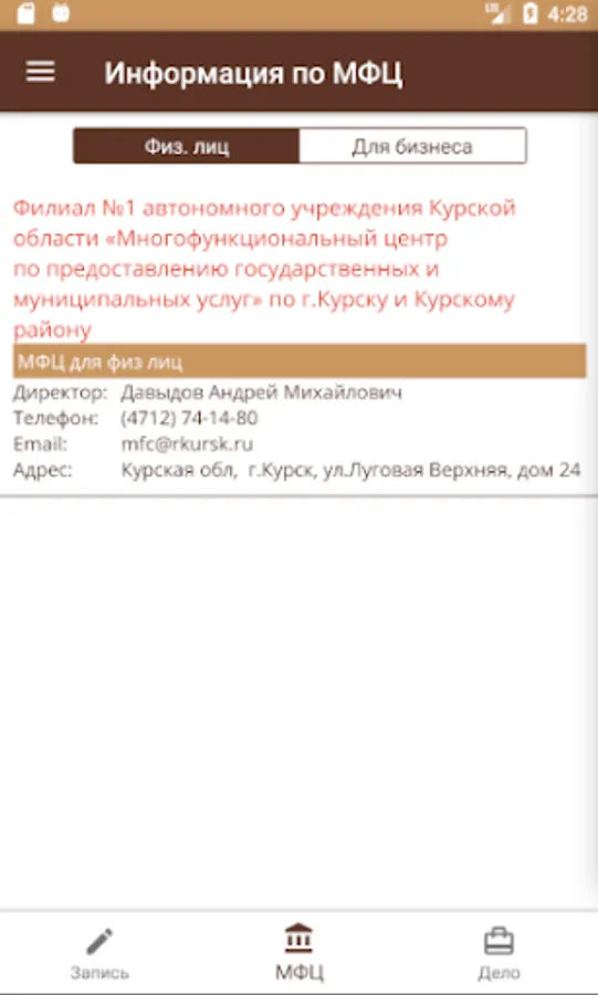 The application, functionally based on the Android platform, allows you to view information about any Multifunctional Center of the Kursk region: its address, work schedule, location on the map. Information is available both on the main offices and on the points of remote access. Also in this application, you can view the news of the MFC network. The application allows you to assess the quality of services rendered and write an appeal to the selected MFC. The ability to scan QR codes for getting the case number.