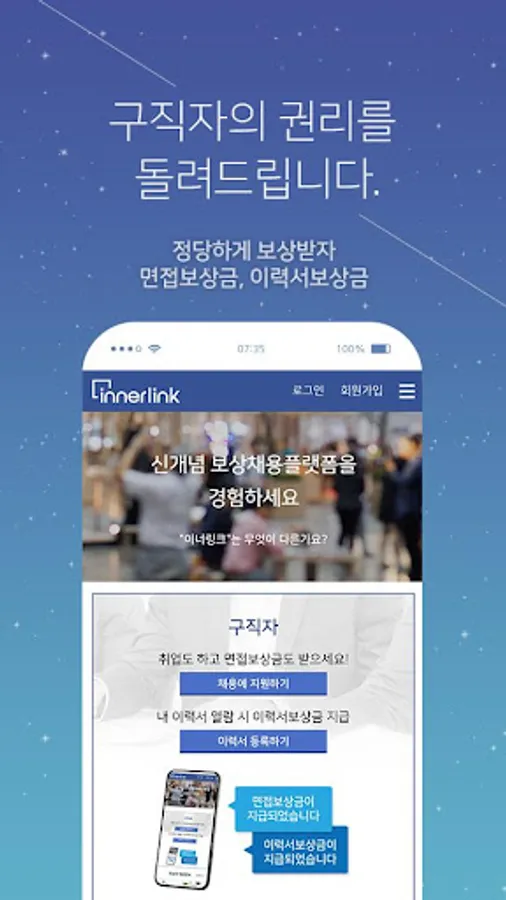 이너링크는, 국내 최초로 구직자에게 면접보상금(면접비), 이력서보상금을 드리는 보상채용플랫폼 입니다.
