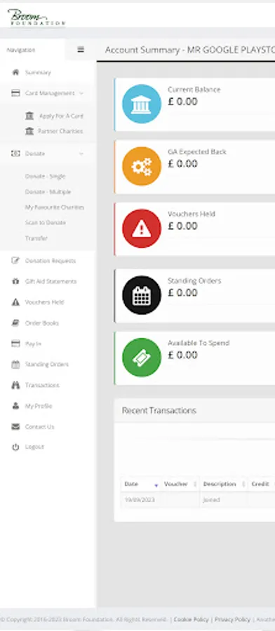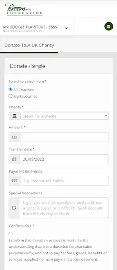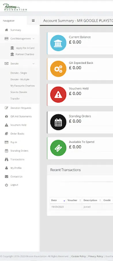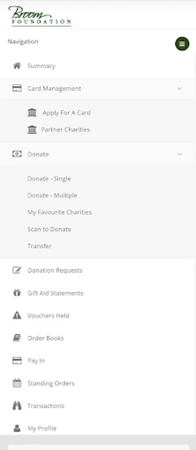 This app enables you to manage all aspects of your Broom Foundation charity account on your device, check your balance, make donations etc.