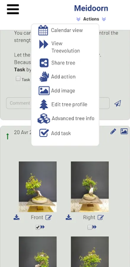 In my journey to become a somewhat decent bonsai artist/enthusiast I struggled a lot with keeping track of what I did when on my trees, what did I do last year on this buxus and how ? How did it look when I got my hands on it for the first time? After the first year ? After I did the first styling ? … I got a lot of information from my teachers, but was not able to get the most out of it just because I forgot …. That's why I started to develop Treevolution, a platform to manage my bonsai journey as easy and effortless as possible.
