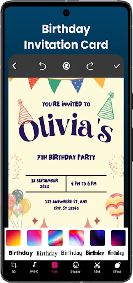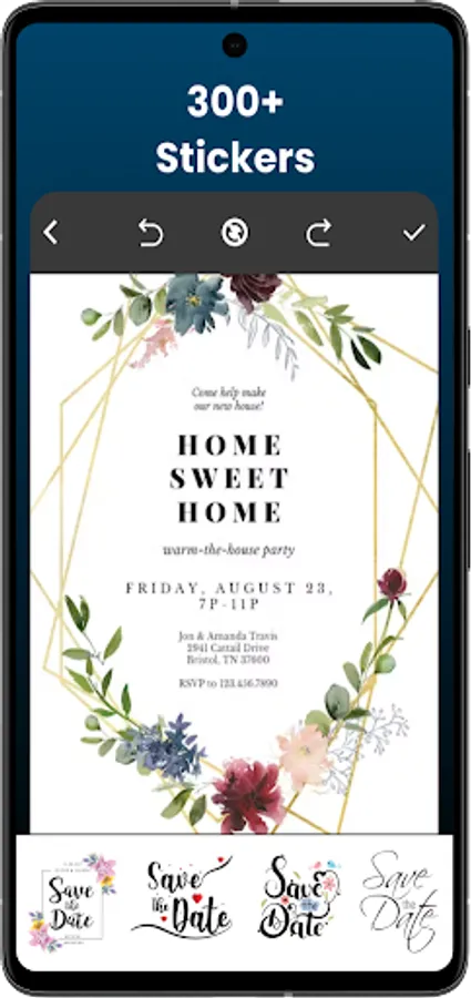 Convert your ideas in Invitations using Stickers, Text, Backgrounds and Images.