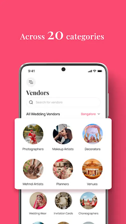 Say goodbye to running around the city to find your wedding vendors! Wedding Bazaar has scores of 2L+ trusted vendors in over 100 Indian cities across 20 categories including wedding venues, photographers, wedding planners, makeup artists, decorators, caterers, choreographers, DJs, etc. With the Wedding Bazaar app, you have access to all of them with just the touch of a button.