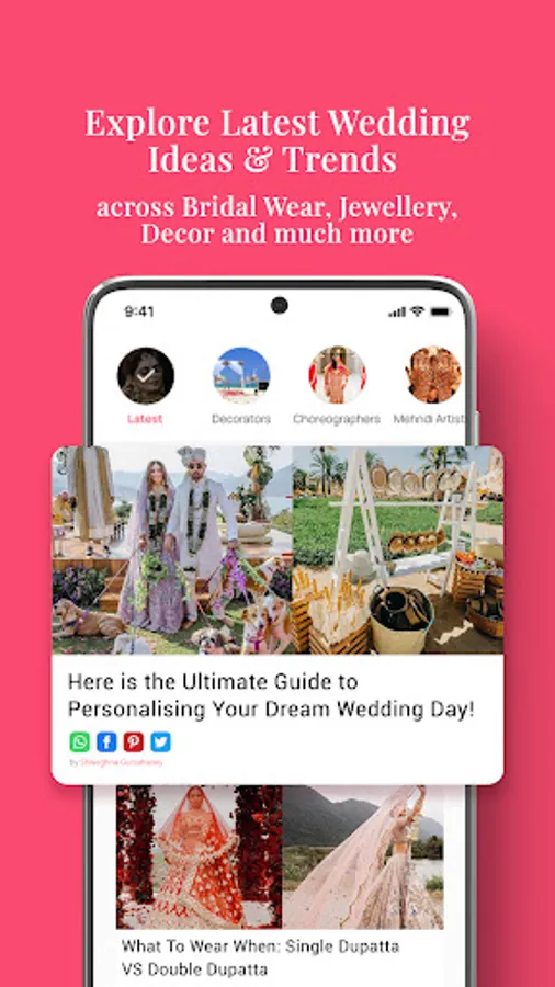 Keep up with what’s in vogue. Browse through thousands of wedding blogs & photos across various categories like bridal fashion, wedding decor ideas, wedding photo & video ideas, makeup tips, hairstyles, groom fashion, etc. that are trending. Find fresh ideas & inspiration and share them with your partner, friends & family members so that you’re all ready to slay on your wedding day!