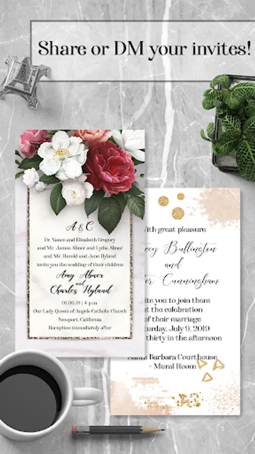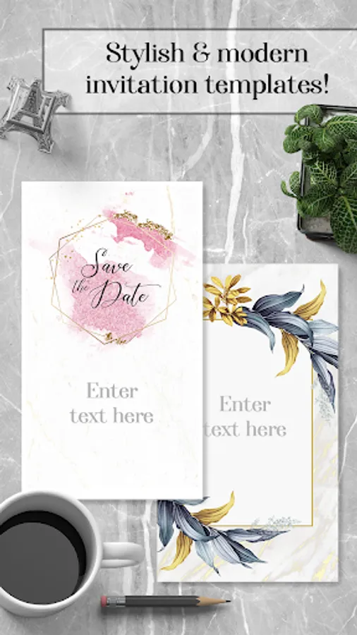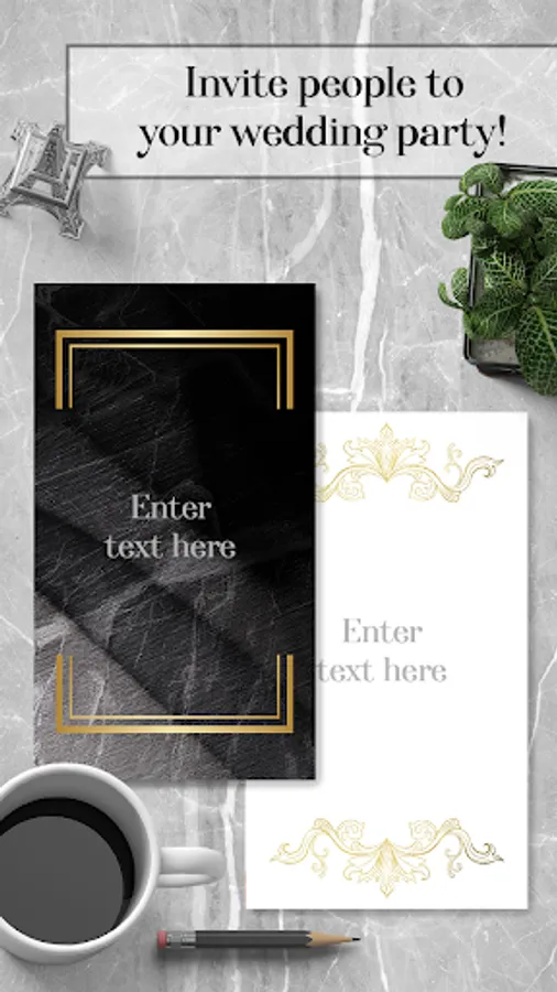 Finding the perfect wedding invitations for your special day is no small task. That is why you need this Wedding Reception Invitation to make it as easy as possible. Each one of its unique wedding invitation designs can be personalized instantly online with text. The ability to take everything from simple wedding invitations to the most elaborate designs and make them one of a kind is what characterizes this wedding invitation e card design app. Explore the stunning selection of editable invitations created with love and devotion. You want your invitations to be as perfect as your wedding day? Invitation templates that can be edited is all you need to complete the checklist for wedding day. Try out the options to create truly unforgettable invites that you can be proud of and that your guests will keep. Insert text to invitation card, save it to your device, and send it to your family and friends!