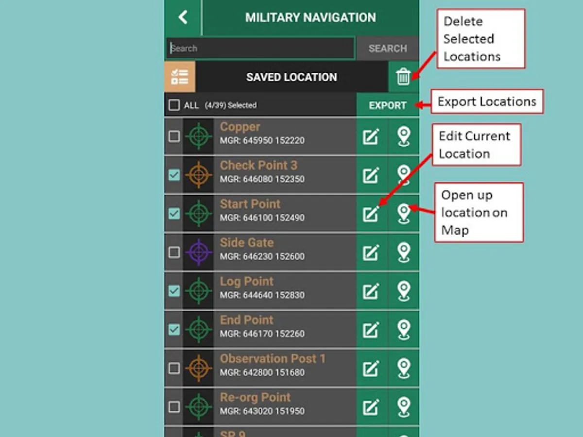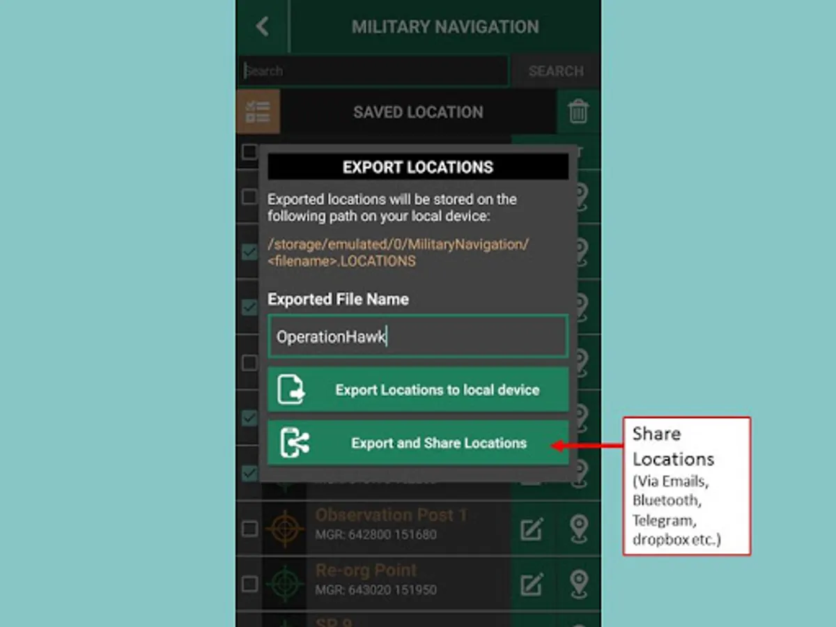 • Location sharing options (Export selected Locations, Share exported locations via Email, Bluetooth, Telegram etc., Import exported locations)