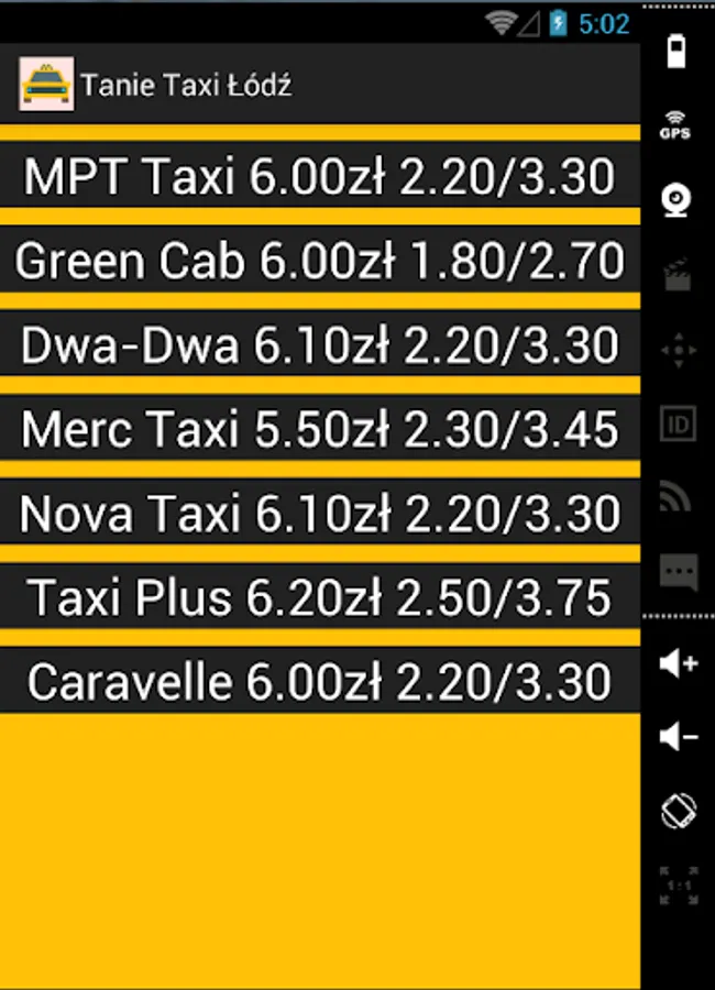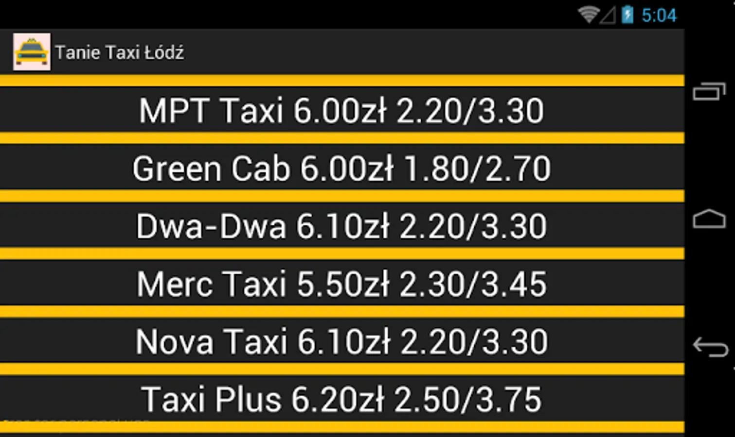 Pricing is taking a seat in the taxi, the price for 1 km in the day, the price for 1 km at night. Format: 6.00zł 2.20 / 3.30.