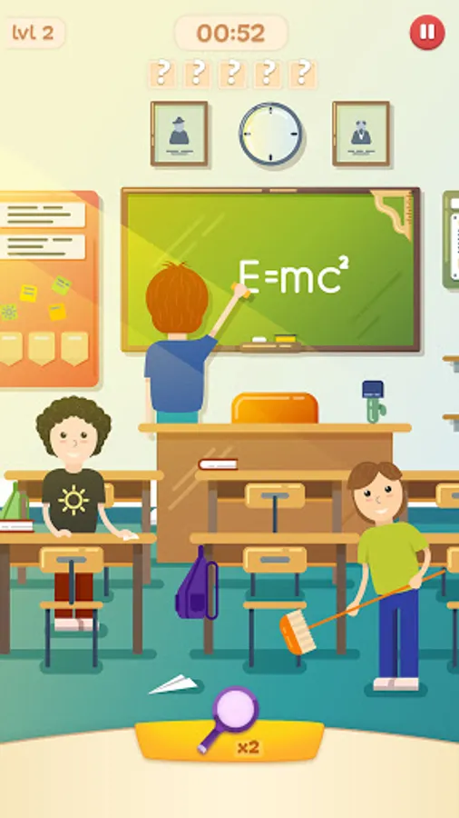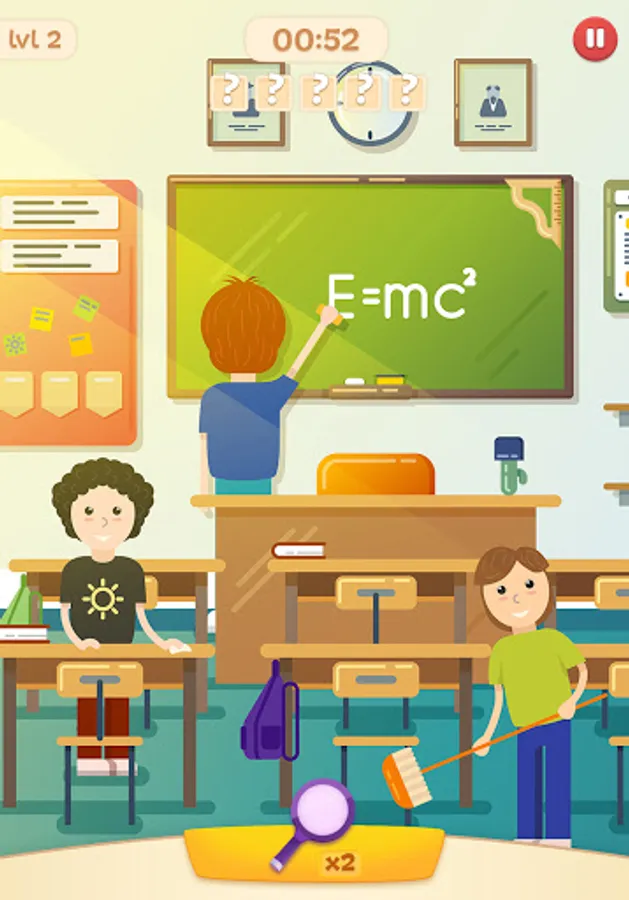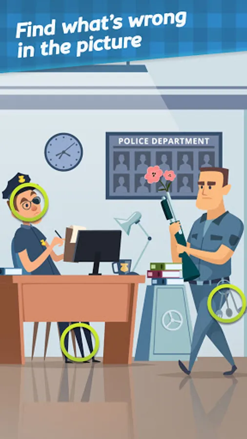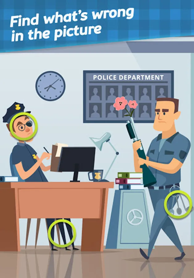 Each level is a new location - police station, office, winter city and many others. Prepare your magnifying glass and be ready to study location throughly! You'll have to find 5 strange and unusual things for location - sombrero on a Christmas tree, galoshes on a tree, skateboard in winter and many others. To make What's Wrong even more interesting you'll have limited time to detect all objects and differences on the location.