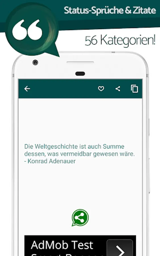 In den Kategorien kannst du dir gezielt Status Sprüche für alle Fälle (Bspw. für den neuen WhatsApp Info-Text). Die Ansicht im jeweiligen Status ermöglich es dir, diesen mit deinen Freunden zu teilen, ihn zu deiner Favoriten-Sammlung hinzuzufügen oder aber auch ihn mit nur einem Tipp in die Zwischenablage kopieren.