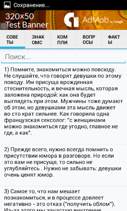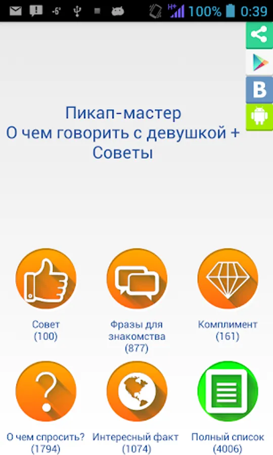 Asked the question "What to say to a girl?" Interested about the pickup? This appendix contains tips phrases for dating, fun facts for conversation. Do not know what to ask - the application will tell! Base of more than 4,000 useful interesting.