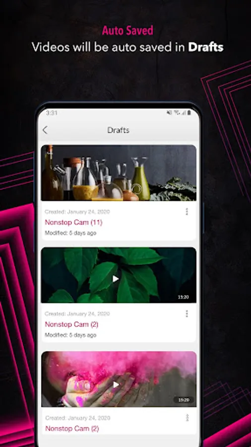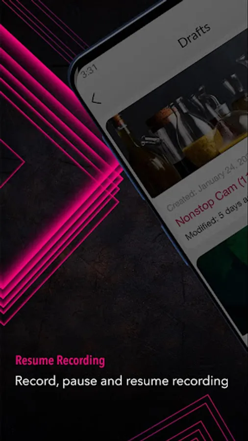 This app is super easy and free to use and makes it easy to pause and continue recording into a single video clip. You do not have to record videos in chunks and splice them together later. Videos will be auto saved in drafts. No editing, no waiting, just fast and fun!