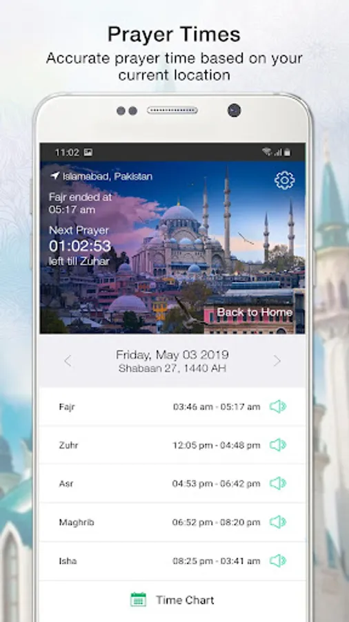 Using your location, it provides you with accurate prayer times for all 5 prayers. It displays each Namaz timing and the amount of time left until the next Azan so that you don’t miss the prayer.