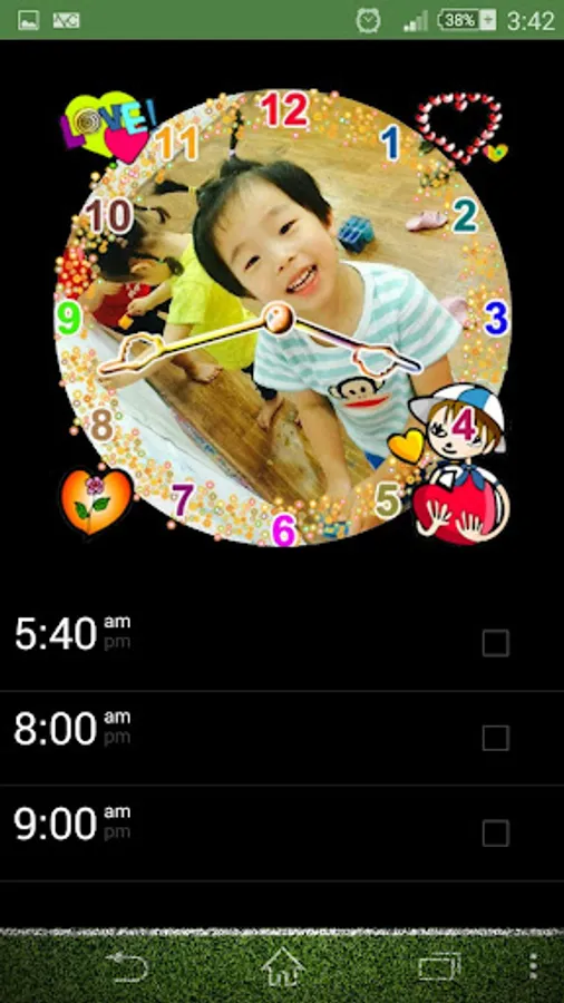 This is a clock widget(2x2 3x3 4x4), you can select a photo from your image gallery and zoom in/out then cut the area you want to set as the background of clock widget. You also can choose the clock frame, digit and hand by yourself to create your own clock. This widget also includes a cute alarm function. I made this program for my new born baby. Hope you will like it and I can make money for his milk. :)