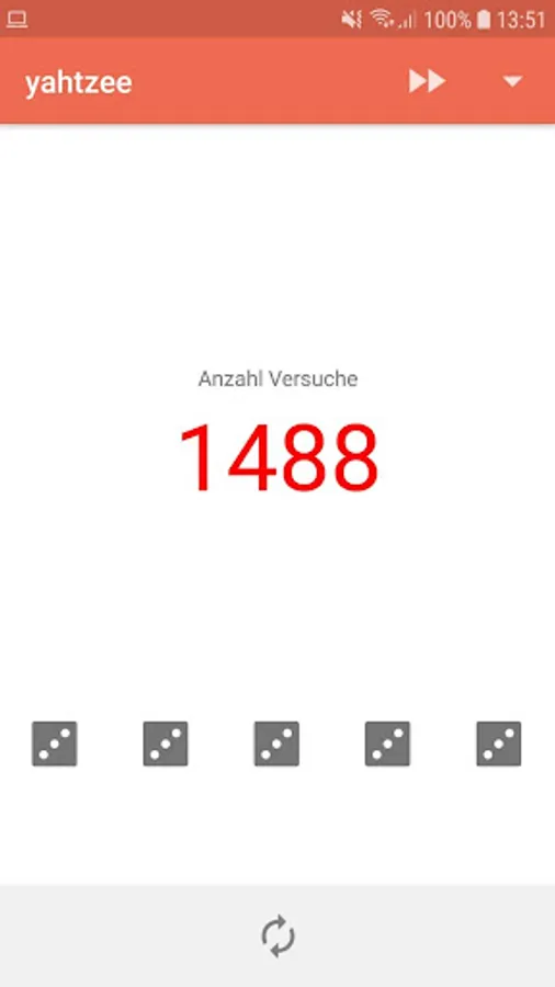 Fun for the whole family! Hit the button and watch the app roll a yahtzee! And not only that! Afterwards you can discover many other great things! The chance for a yahtzee is 1: 1296. How many times have you done 1296 attempts? What was the highest number of trials, what was the least? Questions about questions. So get into the adventure and find out for yourself!