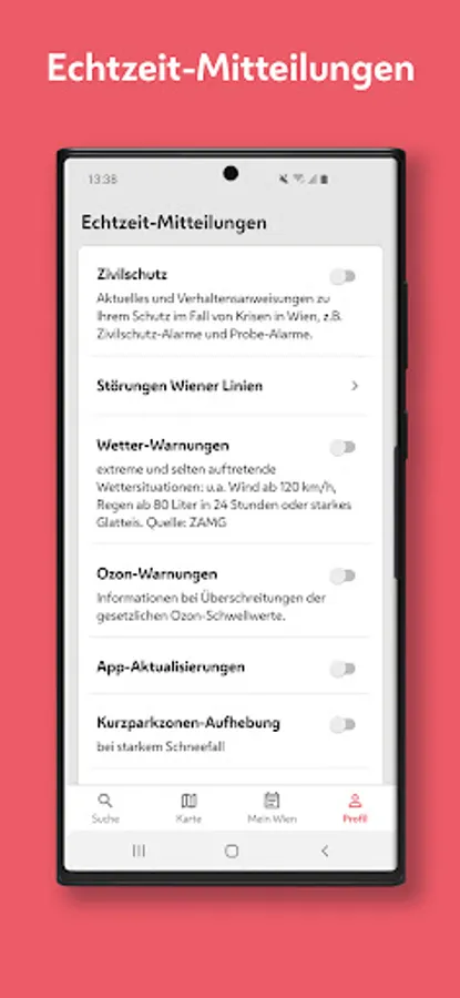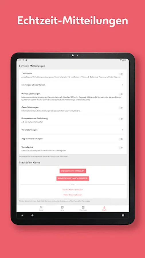 • Management of real-time notifications (disruptions of Wiener Linien, weather warnings, events, civil protection, ...)