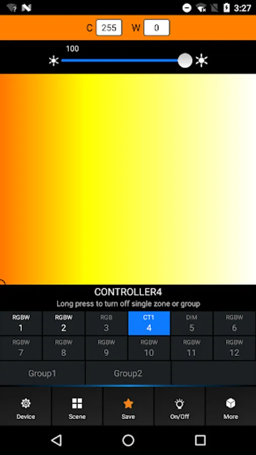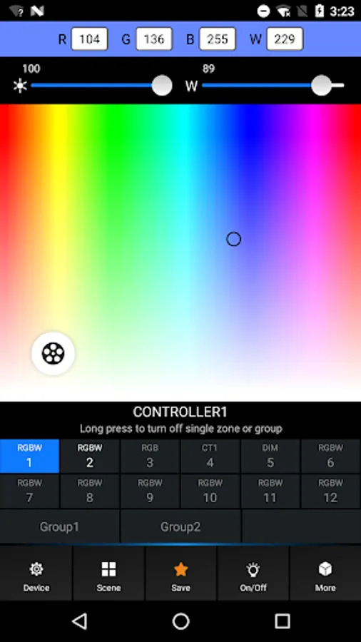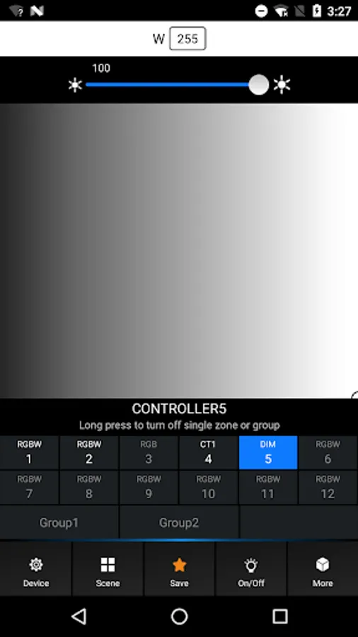 The software supports 12 zone control, Each zone can set to one of the five kinds of LED lights: DIM(W), CT1(NW+WW), CT2(NW+WW+CW), RGB and RGBW. Each zone can save or load maximum four scenes.