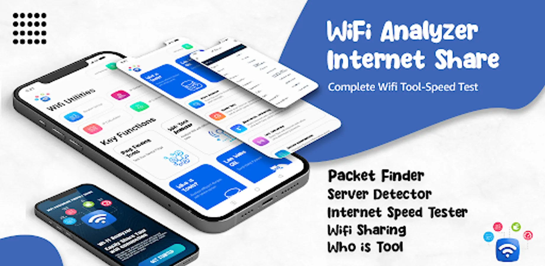 WiFi Analyzer shows the WiFi channels around you. Helps you find a less crowded channel for your WiFi router. A Wifi Scanner within Wifi Analyzer allows users to scan and analyze available wireless networks around them. Wifi Analyzer network analyzer often includes a set of network that help diagnose and resolve network problems. Wifi Analyzer app for Android allows users to measure the speed and quality of their Internet connection with the Internet Speed Test feature. A Wifi Analyzer app for Android with Wifi sharing capabilities allows users to share their Internet connection with other nearby devices.