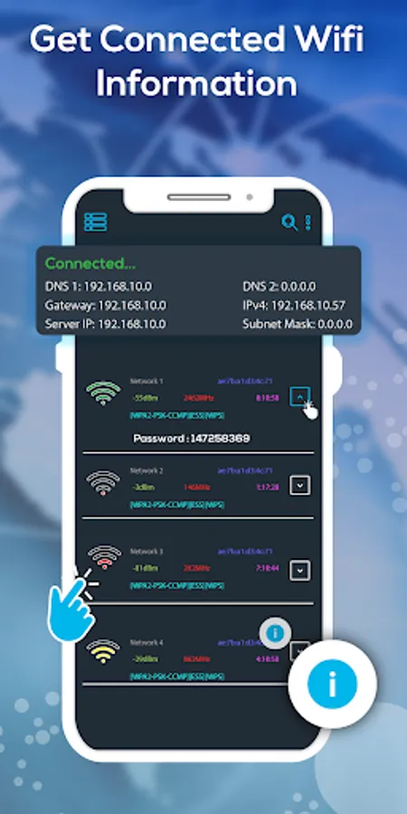 WiFi Password Key Master: Share WiFi Password shows the list of all available WiFi connections available near you and shows: