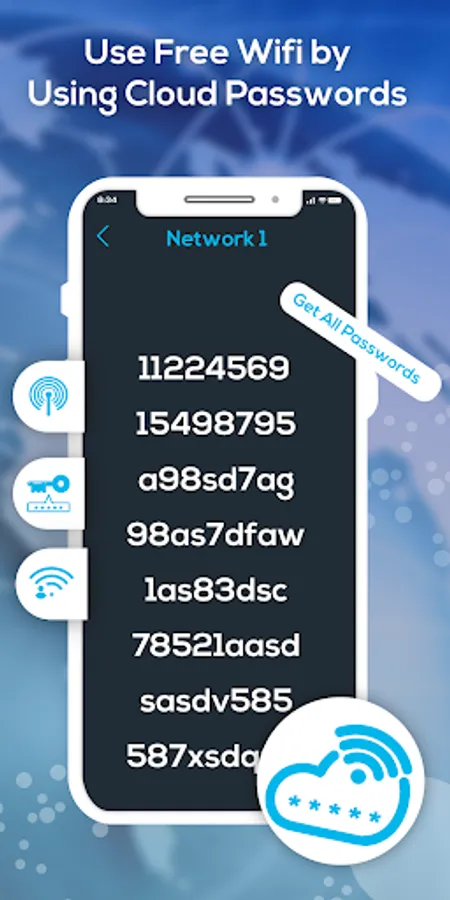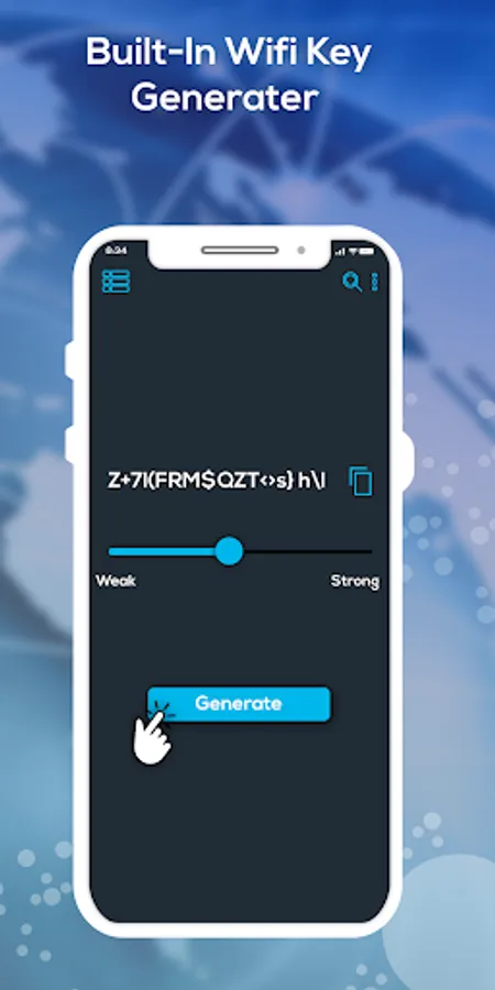 Using a strong algorithm you can generate passwords using the Password Generator in WiFi Password Key Master: Share WiFi Password. Choose weakest, weaker, weak or get strong, stronger, strongest passwords for your WiFi and other platforms.