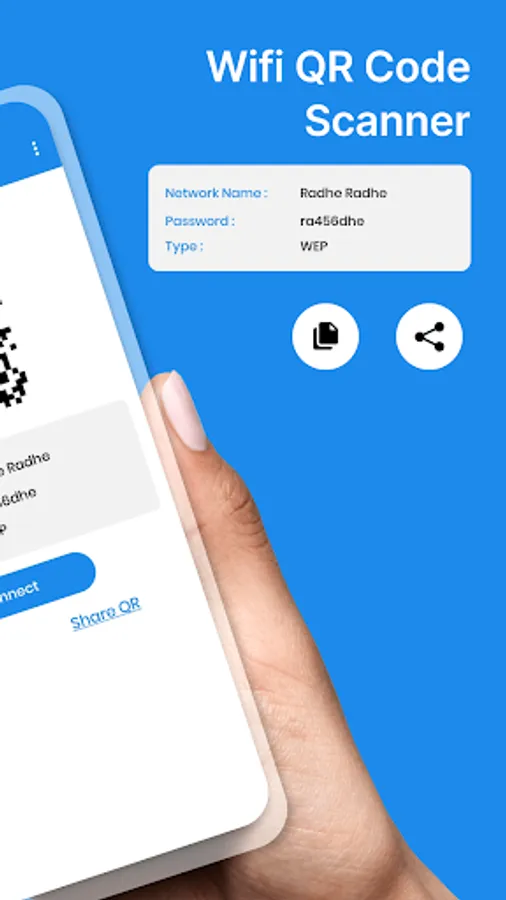 Scan WiFi QR code and connect WiFi automatically. Scan QR and view WiFi detail and share or copy details easily.