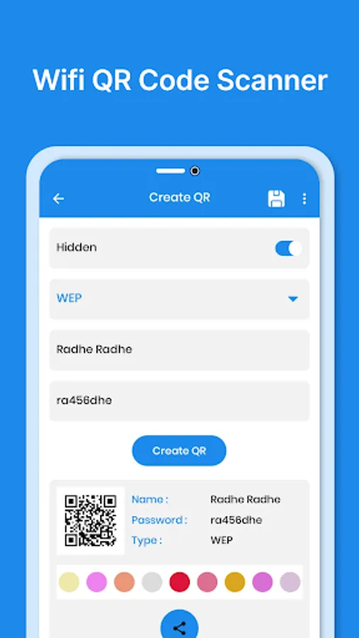 Generate WiFi QR code and customize (QR Code Color, Design, etc). User can sharing QR.