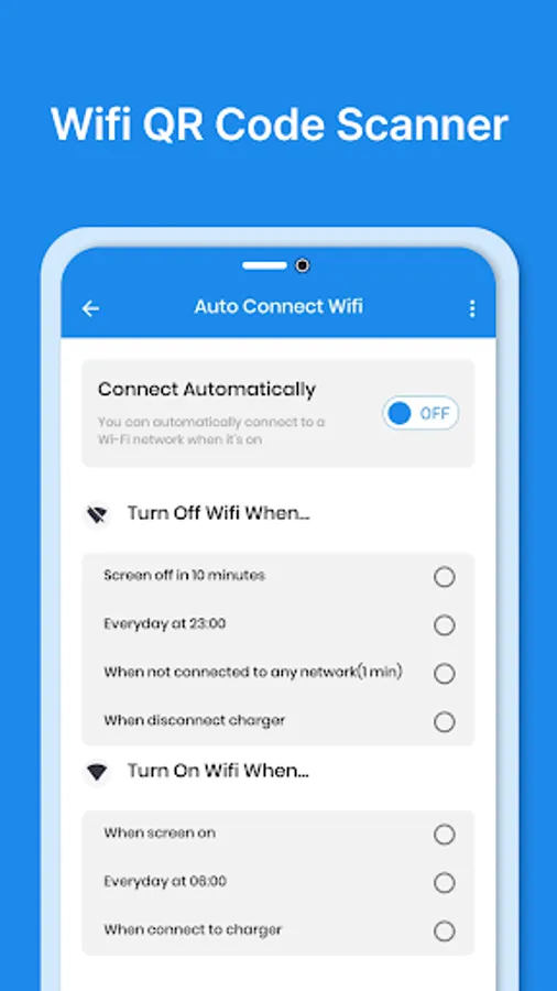 With Wi-Fi Auto Connect app Device Screen is On the WiFi gets Connected, When the device is getting charged the WiFi gets Connected and when the user launch the WiFi required apps then also the WiFi get connected Automatically. When the Device get out of the WIFi Range and the WiFi is not required by the apps then WiFi Automatically get turned Off. Auto WiFi On/Off (Not support android 10 and above devices)