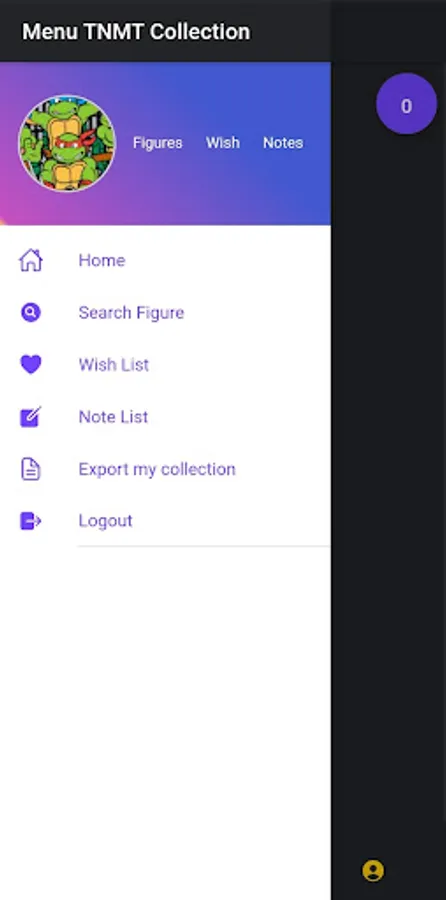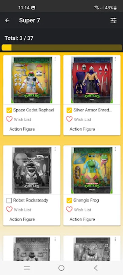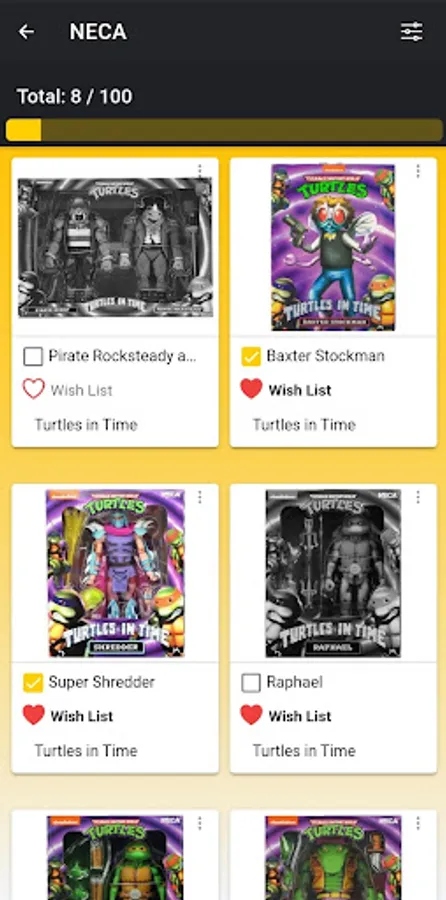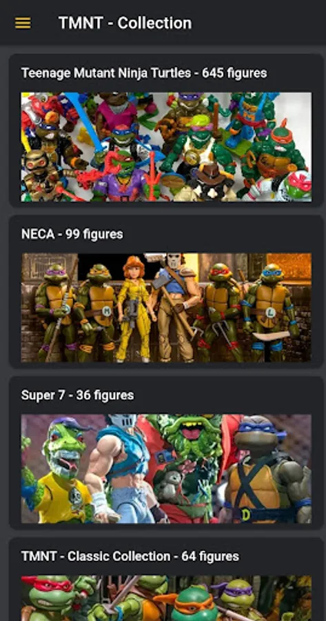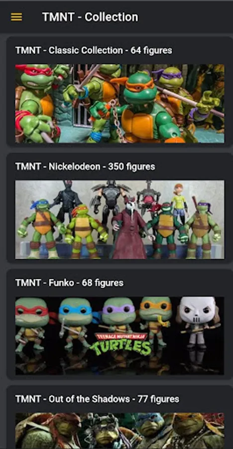 Log in and manage your collection of Ninja Turtles (TMNT) figures (toys)! You just have to enter each category and check the figures you have in your collection and press the save button.