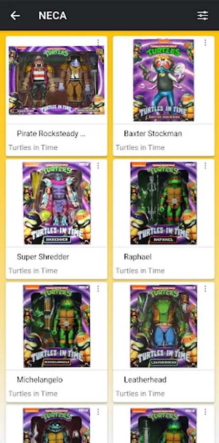 Each category has a list of all the figures (toys) classified by type (Mutations, Martial Arts, Pizza, Ninjutsu, etc). You can use the filter to make your search faster.
