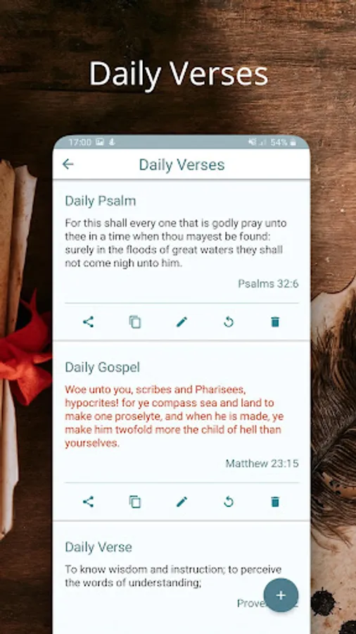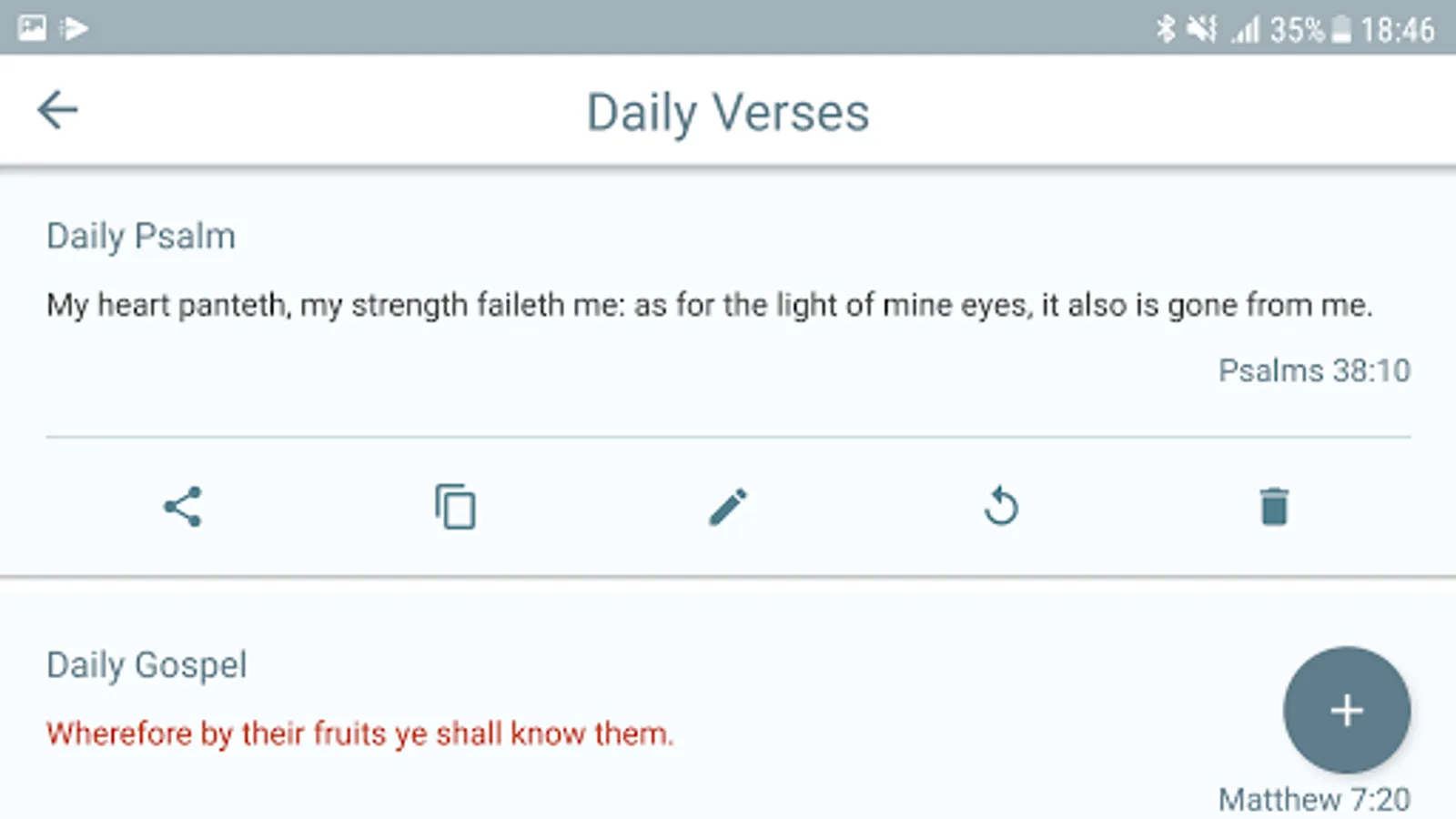 Daily Verse (Daily Psalm, Daily Gospel - you can make your own Daily Verse), Reading Plan (canonical) - read Bible in one Year, 180 Days, 90 Days, Audio Bible (TTS feature) and many others functions.