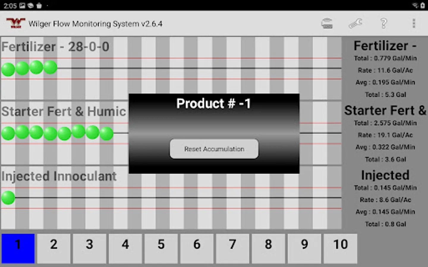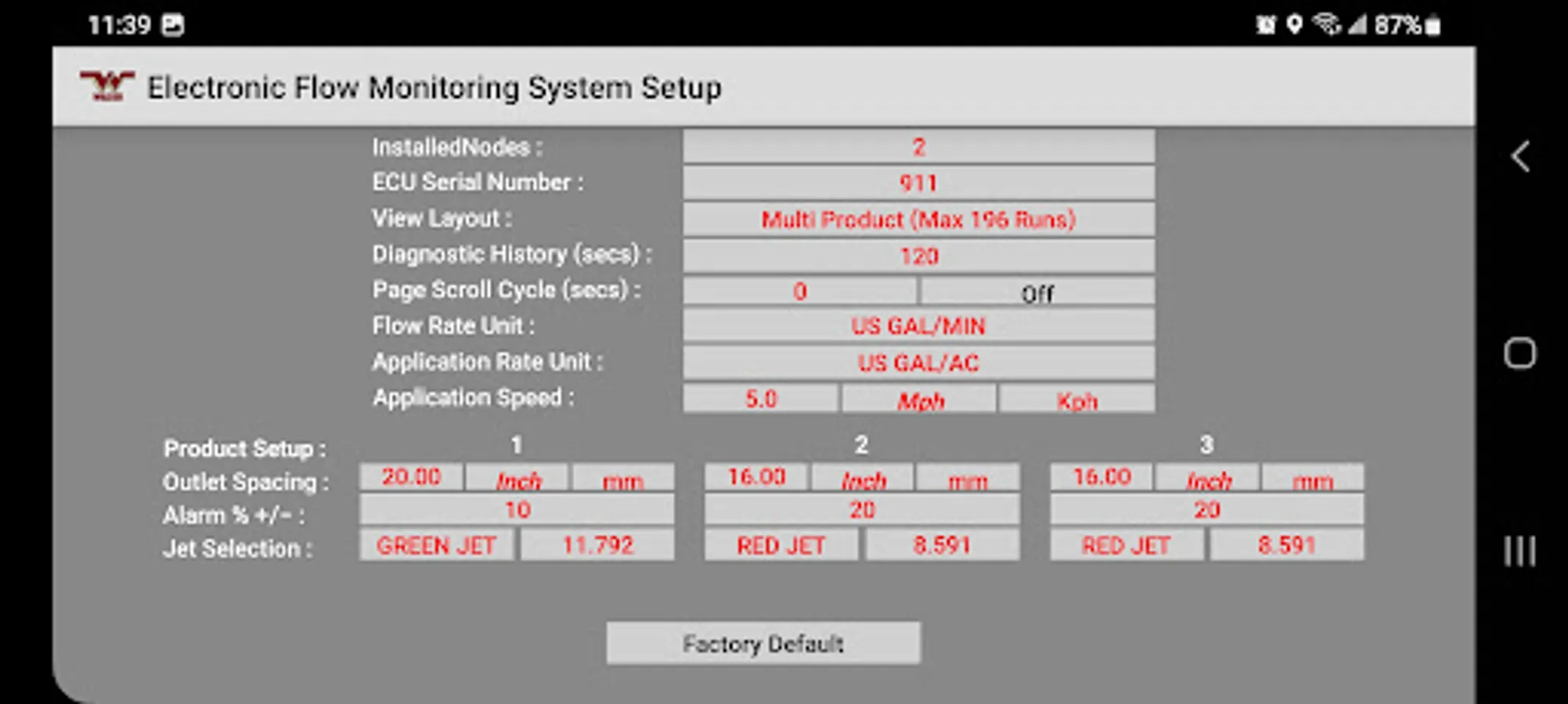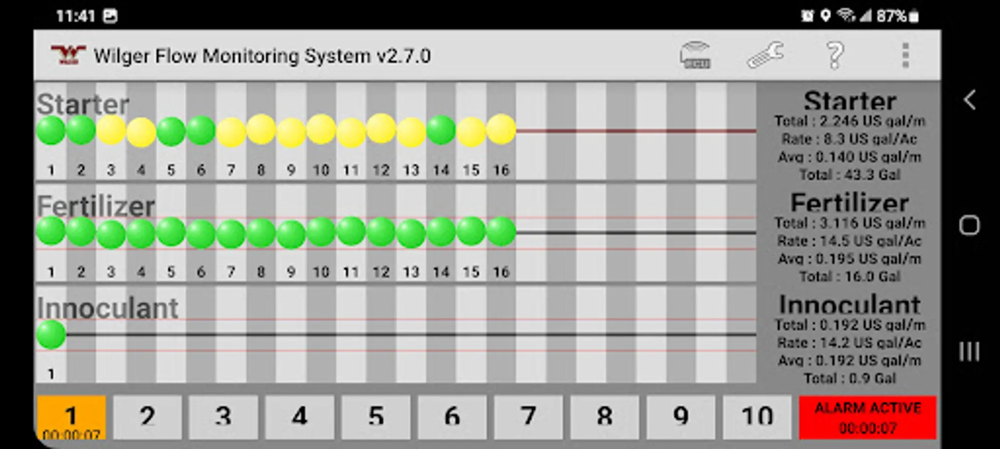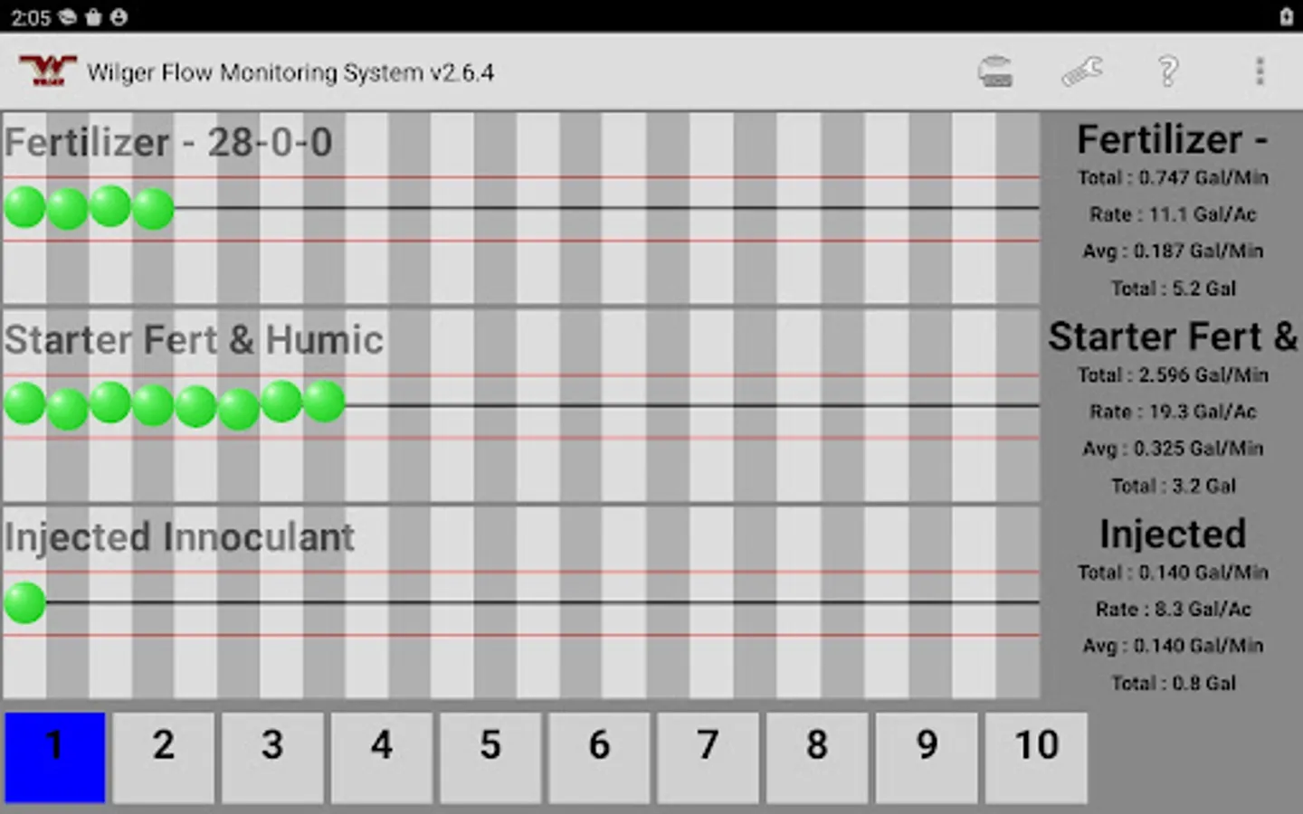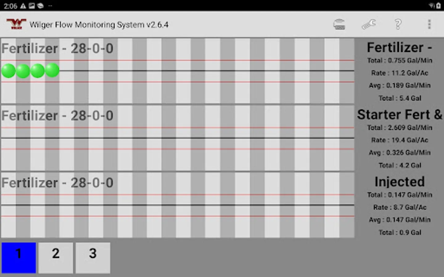 The Wilger Electronic flow monitoring (EFM) system app relays information from a Wilger EFM controller (physical hardware) and provides an application interface showing liquid fertilizer and chemical rates, blockage, and other relevant flow information and alarms. The app is designed to monitor up to 3 products simultaneously, with a maximum of 196 sensors being monitored simultaneously.