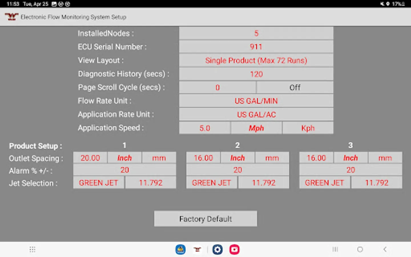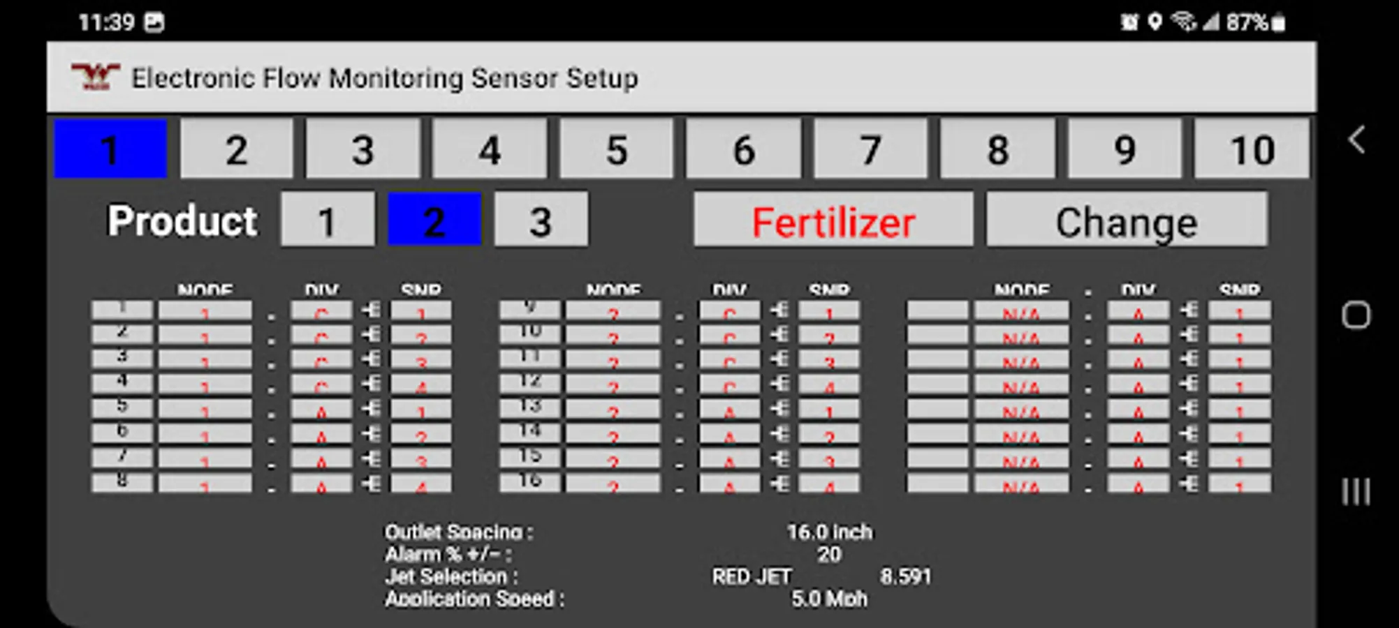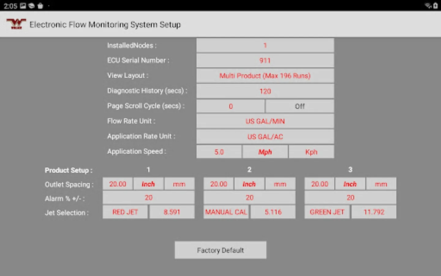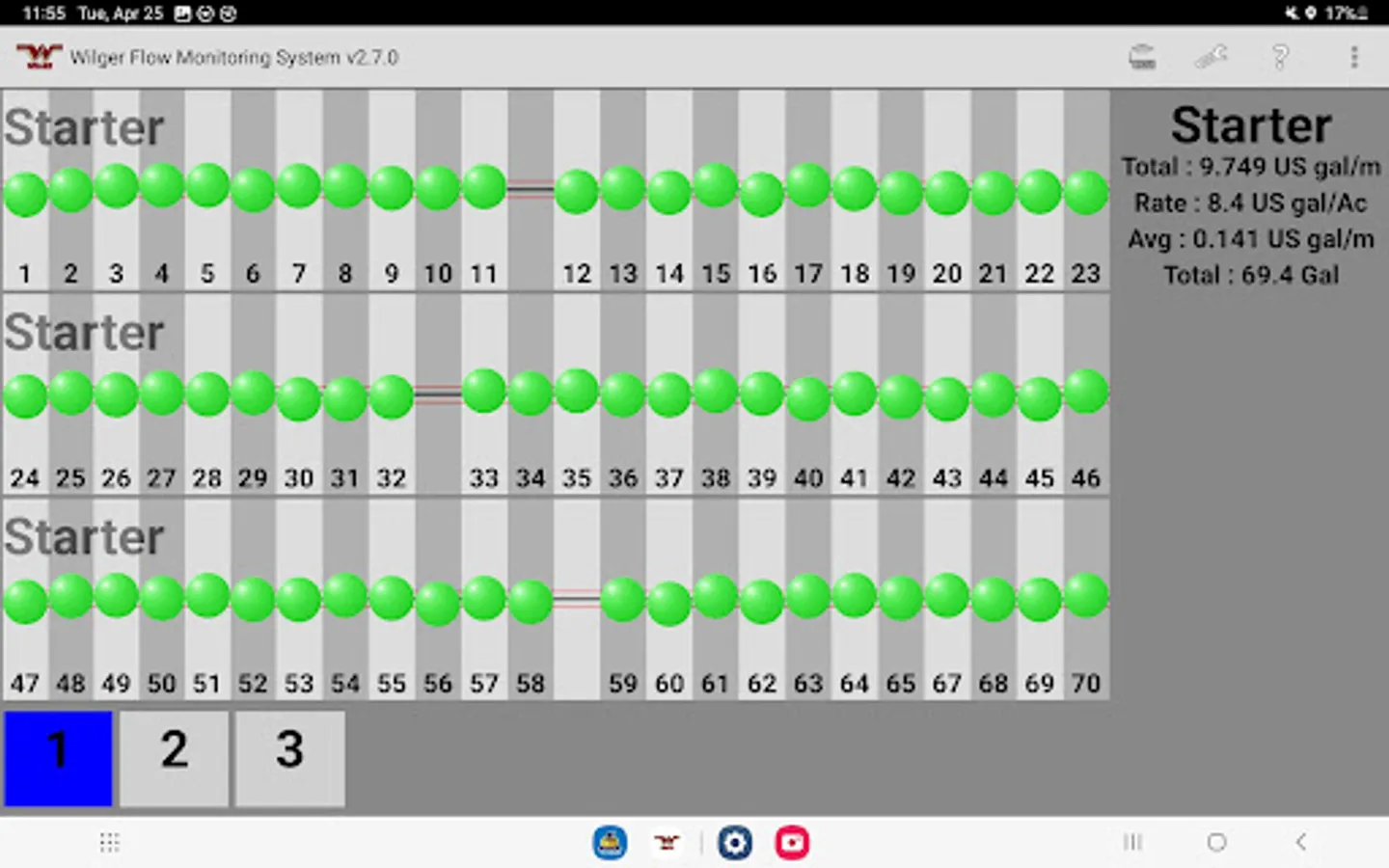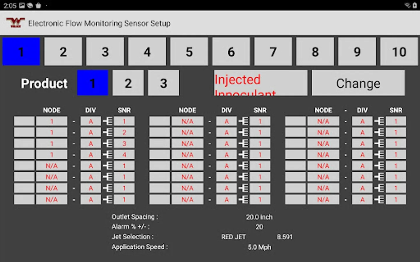 The Wilger Electronic flow monitoring (EFM) system app relays information from a Wilger EFM controller (physical hardware) and provides an application interface showing liquid fertilizer and chemical rates, blockage, and other relevant flow information and alarms. The app is designed to monitor up to 3 products simultaneously, with a maximum of 196 sensors being monitored simultaneously.