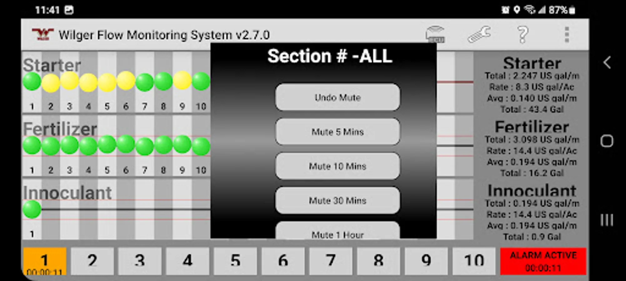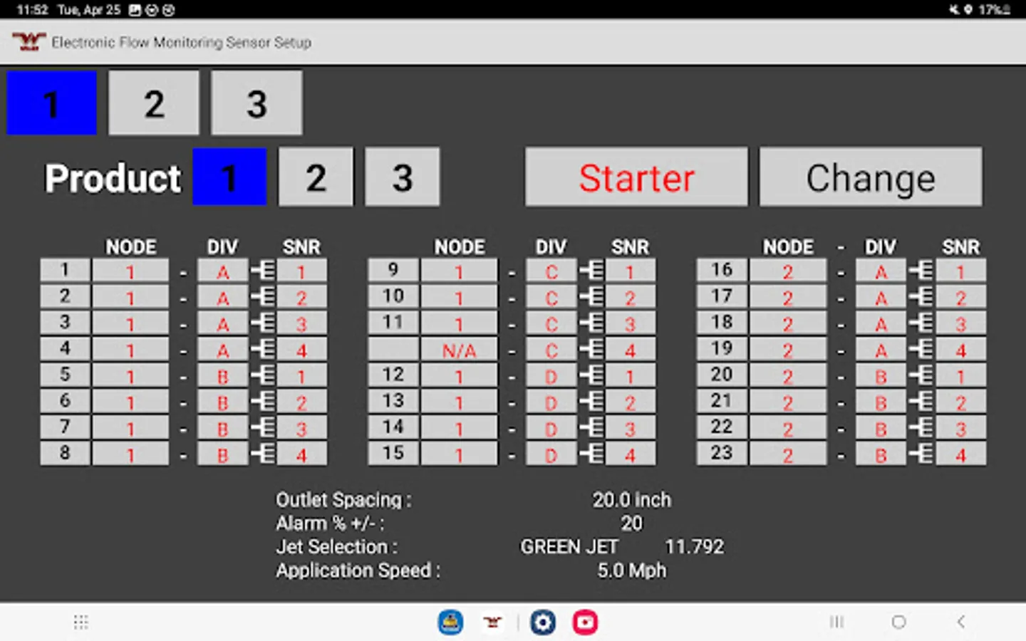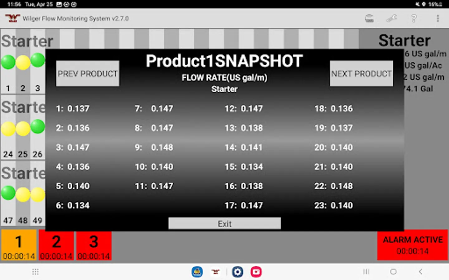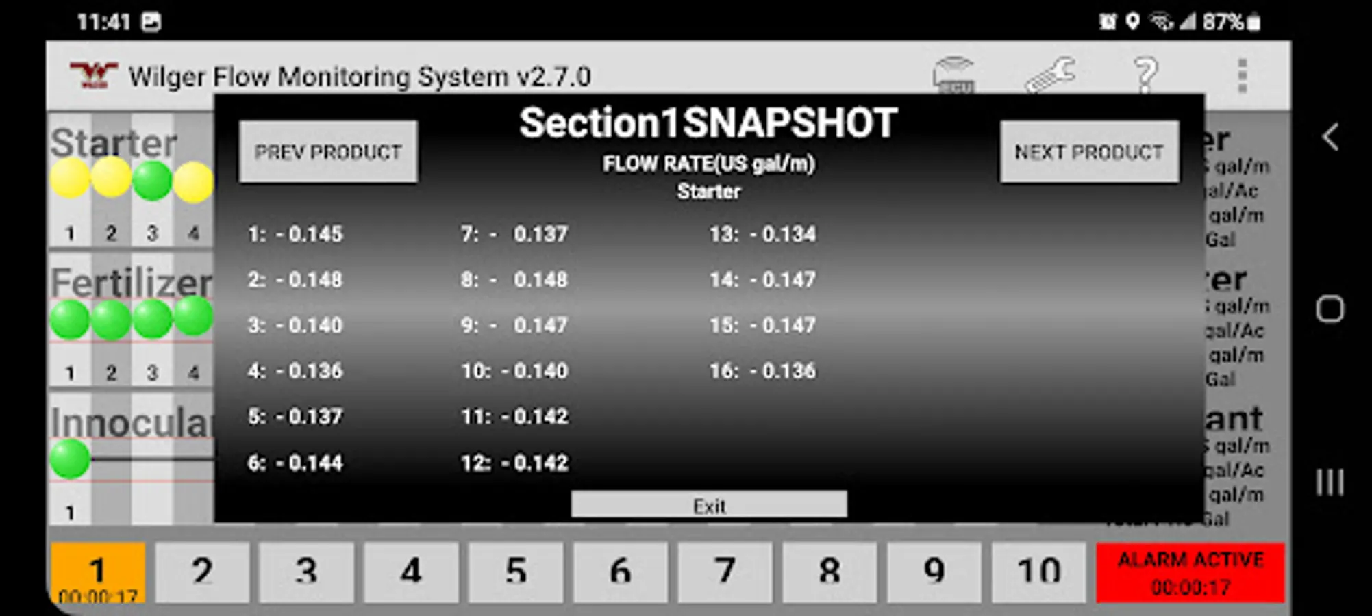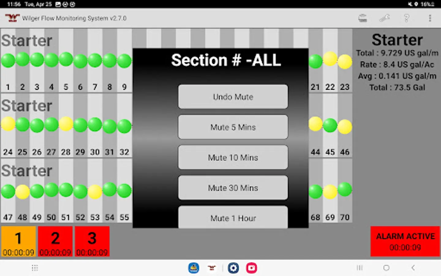 The Wilger Electronic flow monitoring (EFM) system app relays information from a Wilger EFM controller (physical hardware) and provides an application interface showing liquid fertilizer and chemical rates, blockage, and other relevant flow information and alarms. The app is designed to monitor up to 3 products simultaneously, with a maximum of 196 sensors being monitored simultaneously.