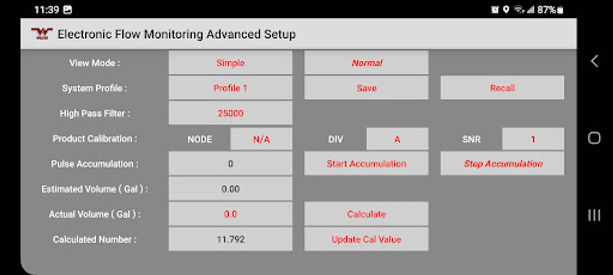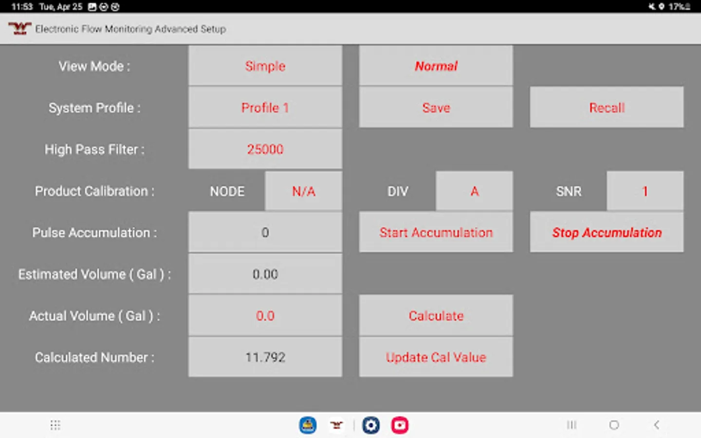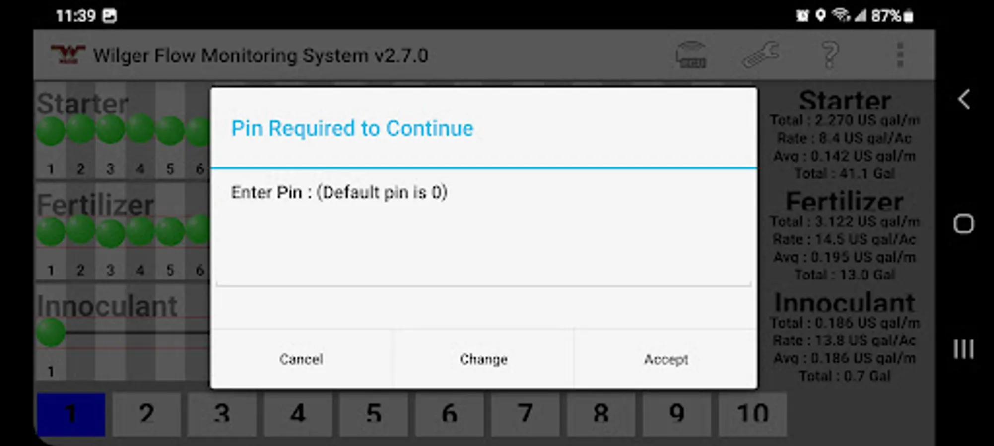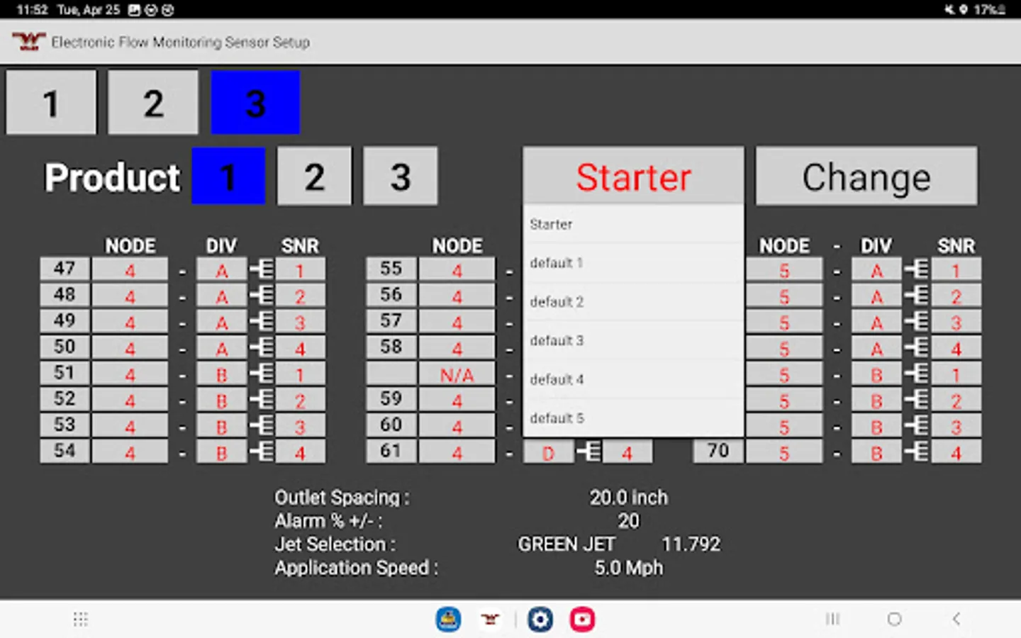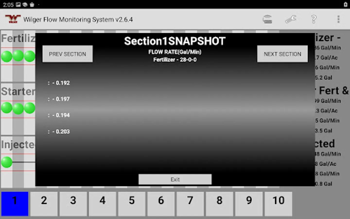 The Wilger Electronic flow monitoring (EFM) system app relays information from a Wilger EFM controller (physical hardware) and provides an application interface showing liquid fertilizer and chemical rates, blockage, and other relevant flow information and alarms. The app is designed to monitor up to 3 products simultaneously, with a maximum of 196 sensors being monitored simultaneously.