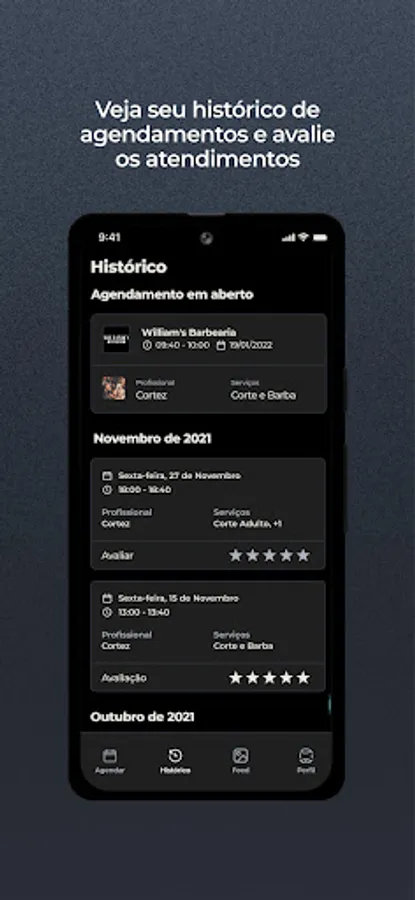 Through the William's Barbearia App, customers can make their appointments in a much more practical way. On the home screen, you can select the services and desired time for your next appointment. On the history screen, you can confirm or cancel your appointments. It is also possible on the profile screen for the customer to edit their information, such as email, profile photo and telephone number.