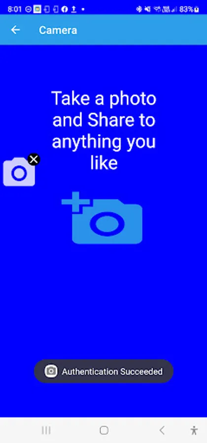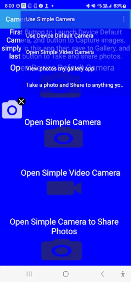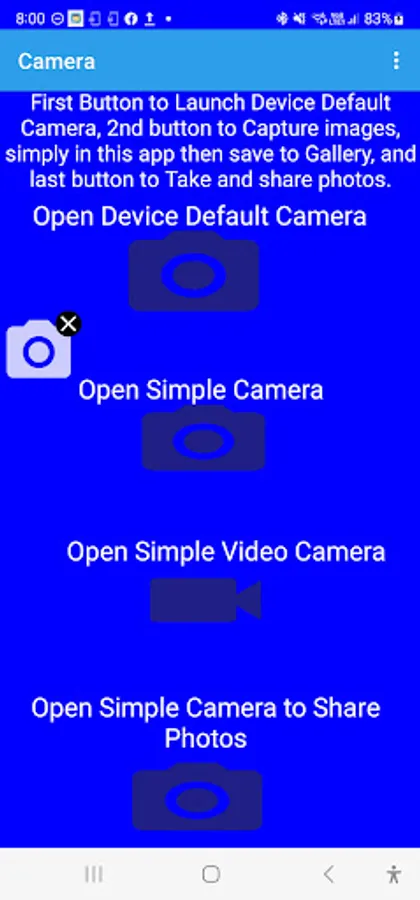 This app allows you to take photos with device default Camera, and simply take a photo, or video by tapping simple camera, or simple video camera, and press the record or take photo button press ok, to save and retry to retake photo, and ok to save and retry to retake, video, it will save to your gallery in a short period of time, you can also take a photo and share with just a few clicks, by, click, dialog then, biometrics, then click, then dialog, the biometrics, and click to take photo, then press ok, then select how you want to share, or click retry to retake photo. App can also be accessed other ways, and other ways click to take photos. Use to make life easier if you are not a pro photographer your choice, is to use simple camera or, simple video camera, or if you are pro choice for simplicity and complex way of taking photos, thus making life easier.