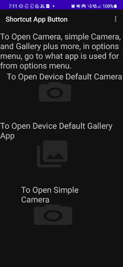 You can remap your android devices side key, which is usually a power key, simply set this app, to launch when you double press side key, to perform actions like take photos, and launch gallery app, just by pressing one of 3 buttons, and more available, in options menu, also if you press volume up key 2 times, it will launch camera, and once to launch android default, your device assistant app to speak to phone and do actions, features, like torch on off, or direct access to app, messaging by options menu, with more available in options menu. Easy to use makes life easier, even use as a normal app. Don't need to use side key, that's what it's designed for, if no side key, or special functions on power key, then use as normal app.
