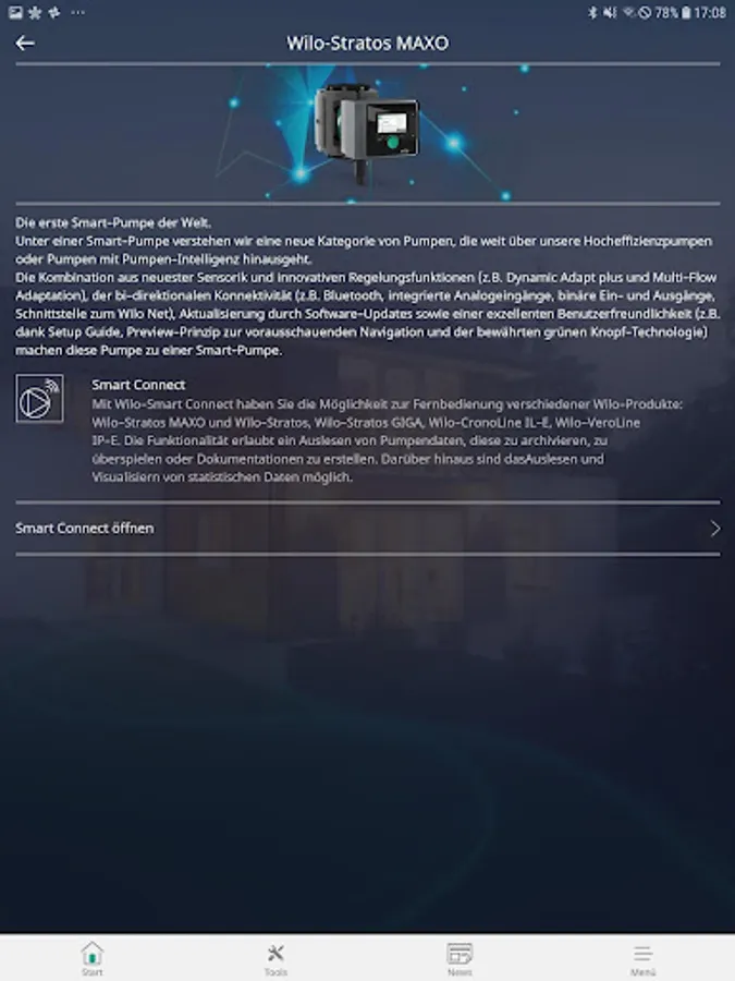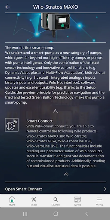 ● Smart Connect: With Wilo-Smart Connect, you are able to remote control the following Wilo products: Wilo-Stratos MAXO und Wilo-Stratos, Wilo-Stratos GIGA, Wilo-CronoLine IL-E, Wilo-VeroLine IP-E.