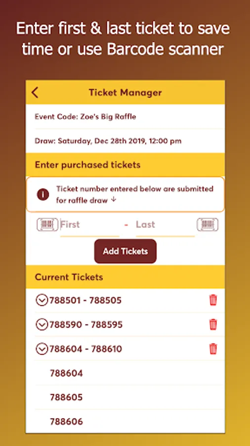 Zillywin is the fastest way to manage your raffle tickets at an event. Simply connect to an event by entering the organizer’s event code, and then enter your ticket numbers. For strings of tickets, you only need to enter the first and last ticket numbers to save time. Managing your tickets through Zillywin saves you the hassle of looking at each of your tickets manually. Now, you can buy more tickets to increase your odds of winning and then put your tickets away to enjoy the event.