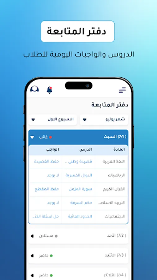 حيث يقوم كل مستخدم بالعمل على مهامة التي كان يقوم بها ورقيا من خلال التطبيق، فمثلا يستطيع المعلم كتاب دروس وواجبات الأيام الدراسية ويستطيع الطلاب واولياء أمورهم الإطلاع على هذه البيانات، ويستطيع الطلاب الإطلاع على منهجهم الدراسي والملخصات التي يرفعها له المعلم، إضافتا الى أن المشرفين يستطيعون إرسال رسائل للطلاب واولياء الامور والمعلمين، الى غير ذلك من المهام التي تخدم العملية التعليمية.