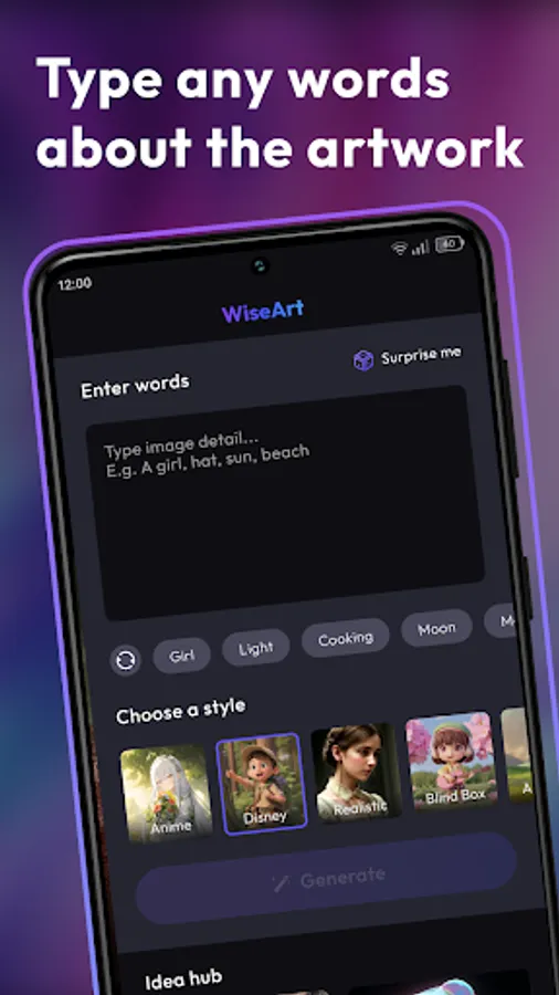 Create artwork effortlessly and hassle-free! All you need to do is enter a prompt, pick an art style (Anime, Realistic, Disney, Ink Painting etc.) -and watch WiseArt bring your idea to life in seconds!