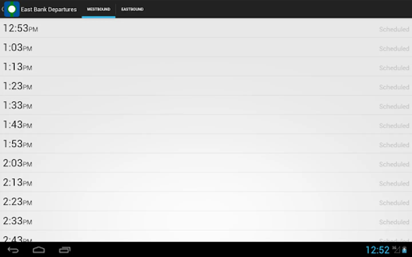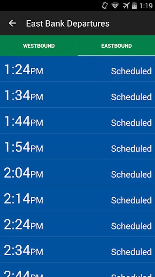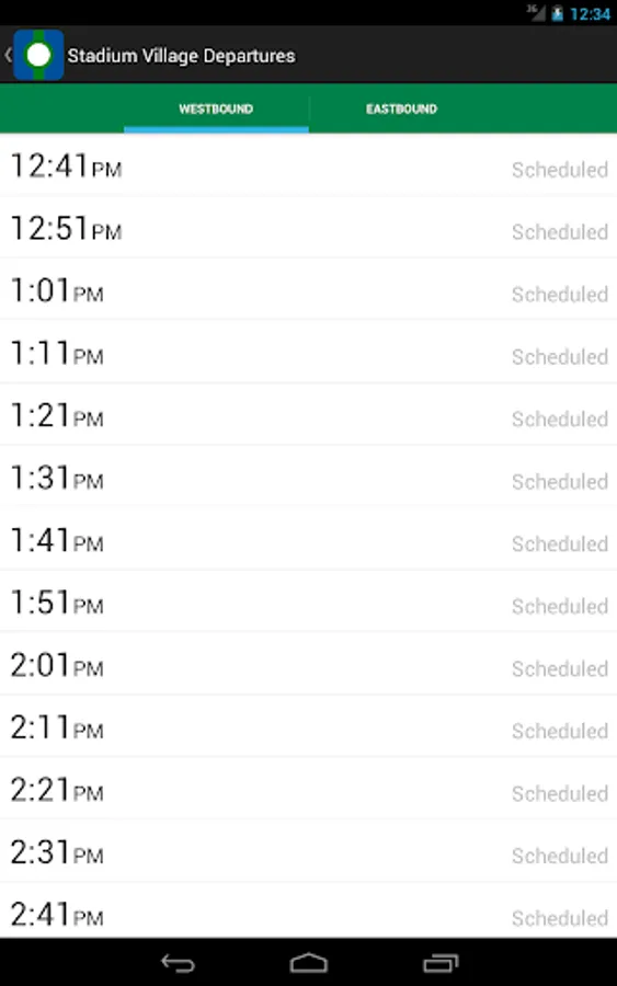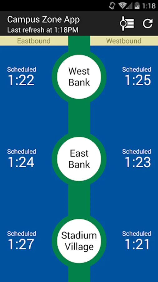 Times of arrival for the 3 stations are displayed on their left and right. Times usually are shown as "scheduled," but sometimes GPS data gives a "predicted" time of arrival.