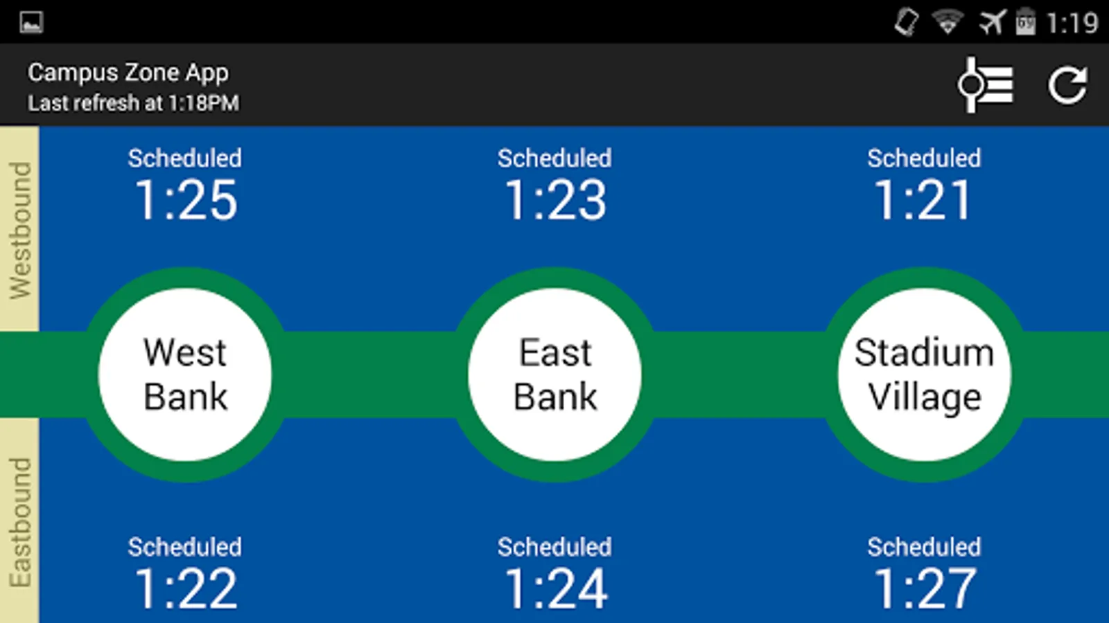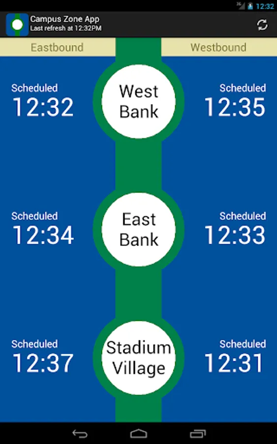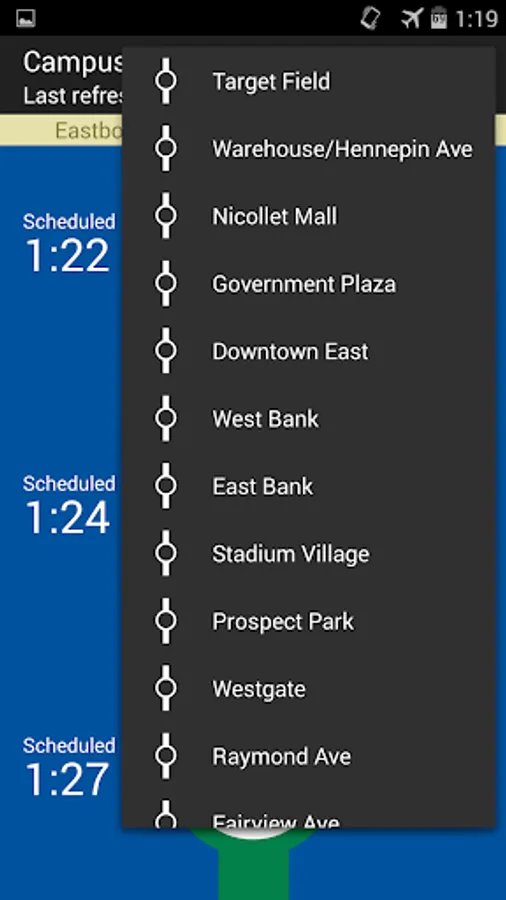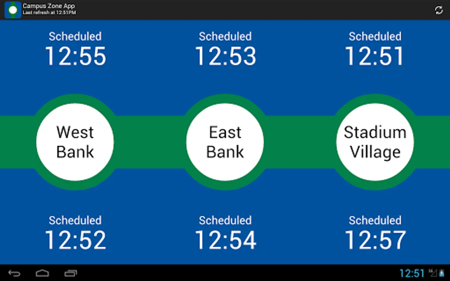 Displays the next Metro Transit Green Line arrival times for the three stops that U of M students can ride for free using their Campus Zone Pass.