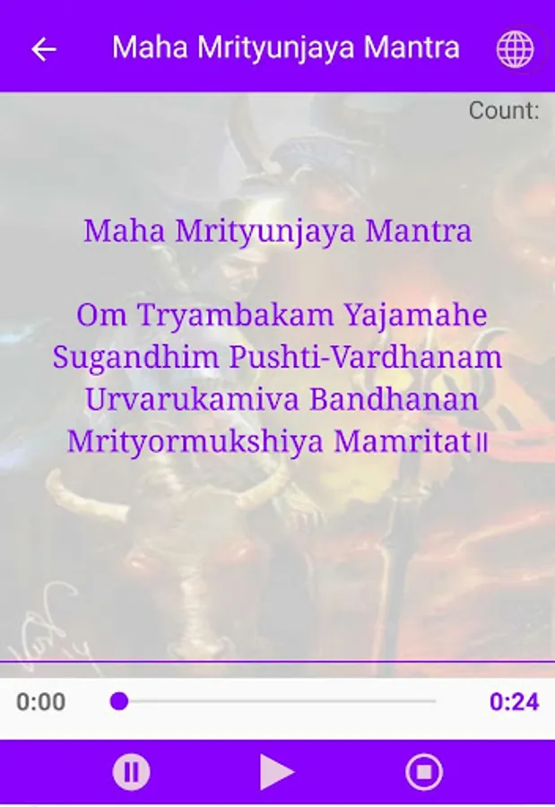 • Option to set number of Japa or repetition for Mantra like 1 time. 2 time, 3 times, 12 times, 51 times, or 108 times etc.