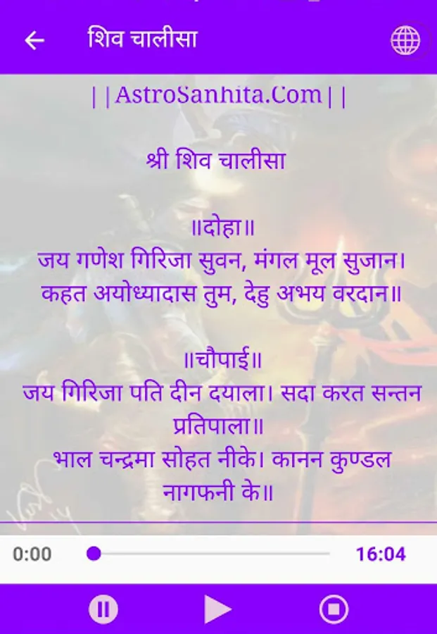 AstroSanhita.Com's Shiva Mahamrityunjaya-Tandava-Chalisa-Arti-Stuti App with Shiv Maha Mantra, Shiv Chalisa, Shiv Tandav Strotram , Shiv Maha Mrutyunjay Mantra, 108 Names of Shiv, Shiv Raksha Strotram, Shiv Aarti and Shiv Stuti with HD High Quality sound. An offline app which does not require any internet connection No Internet connection.