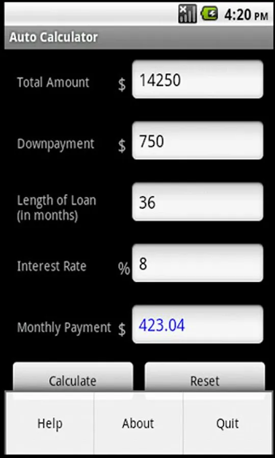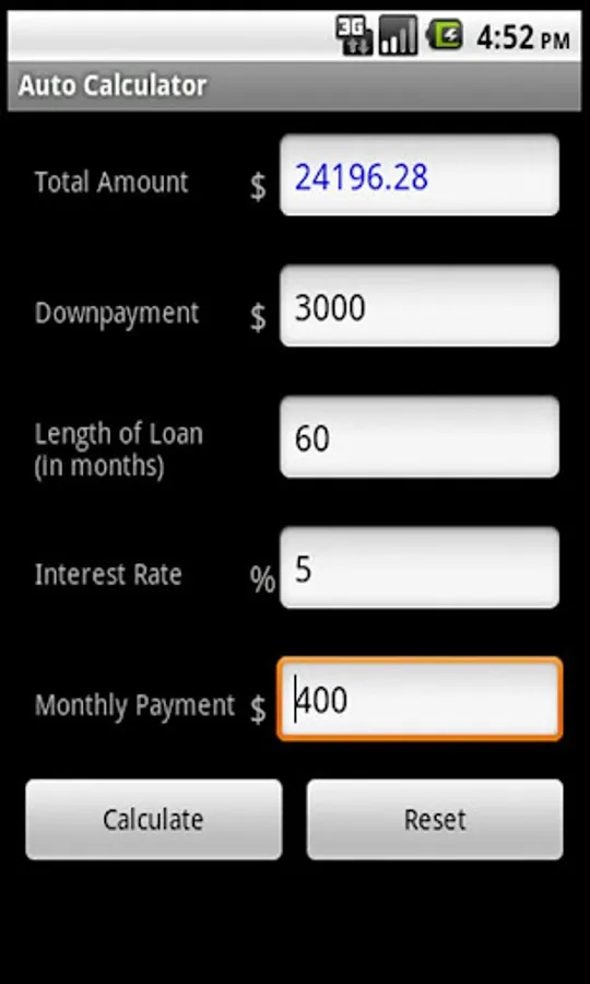 This is a must have tool when negotiating auto prices on-the-fly. Use the Auto Calculator to figure out the your monthly payments, downpayment, total price of the vehicle, and loan length. Quickly change numbers and re-calculate new values as you hash out the price with your auto dealer.