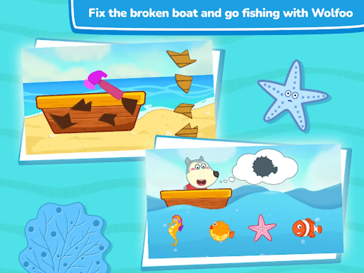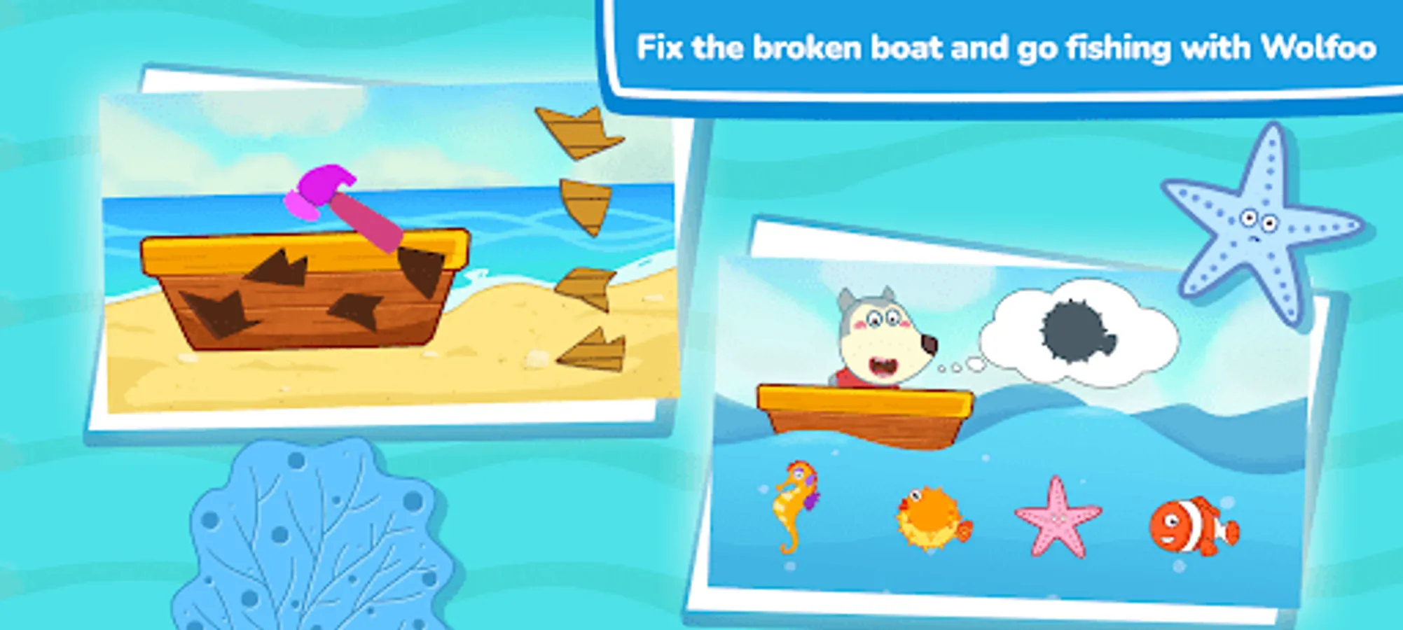 2. Fishing: Help Wolfoo clean and repair the broken boat and let's go fishing