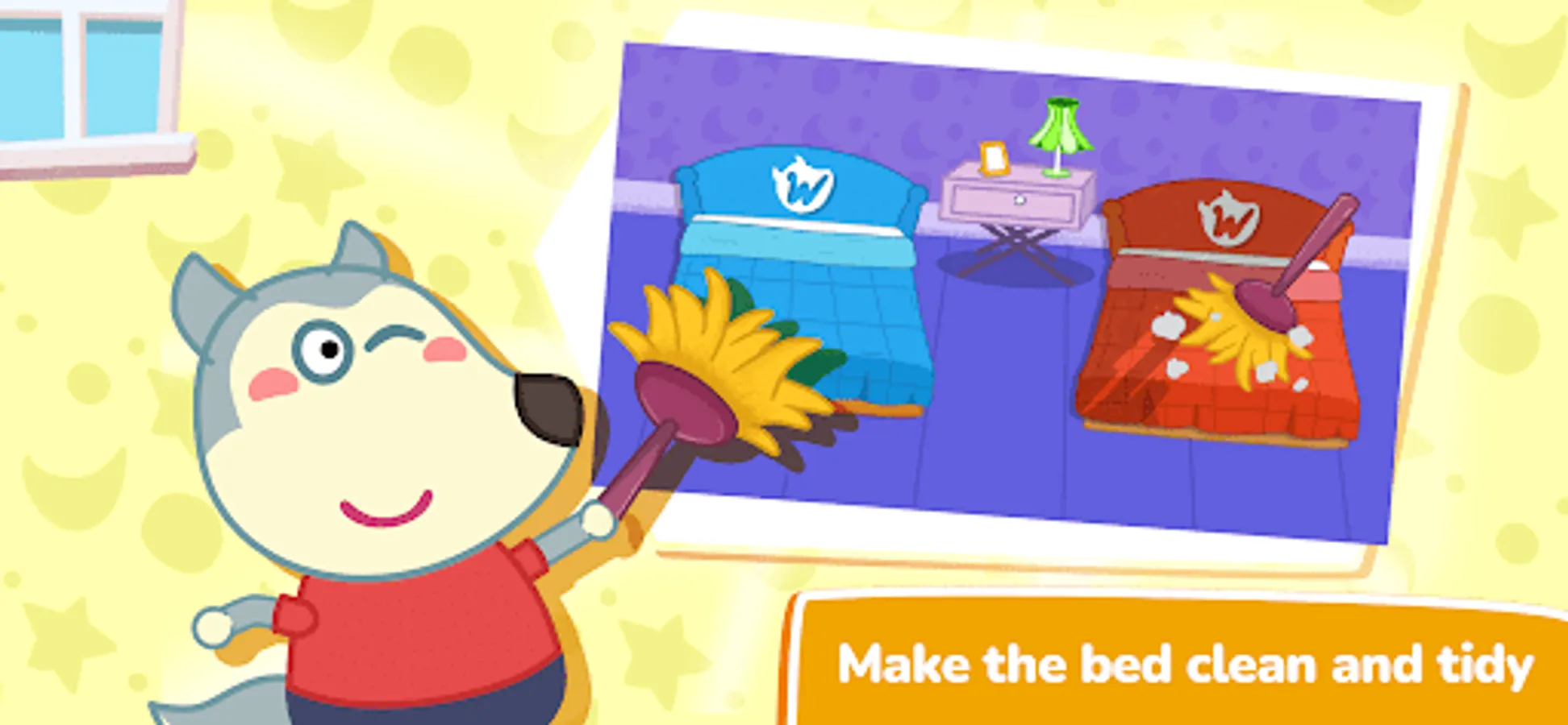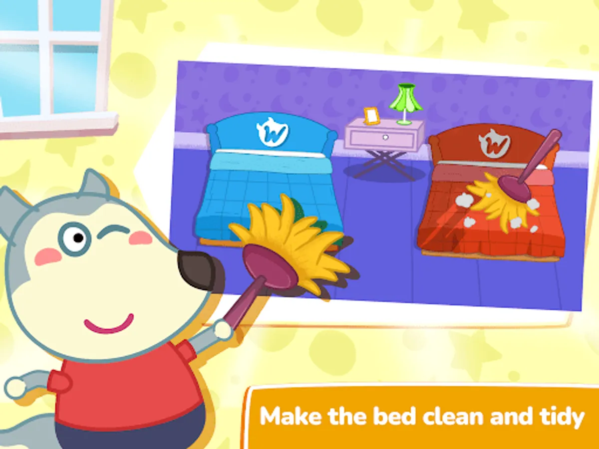 In this game Wolfoo Learns: Little Baby DIY, your child will have the task of helping Wolfoo perform simple housework and repair items. With interesting activities such as cooking, baking, fishing, sewing clothes, washing clothes, cleaning bed, .. in your home.
