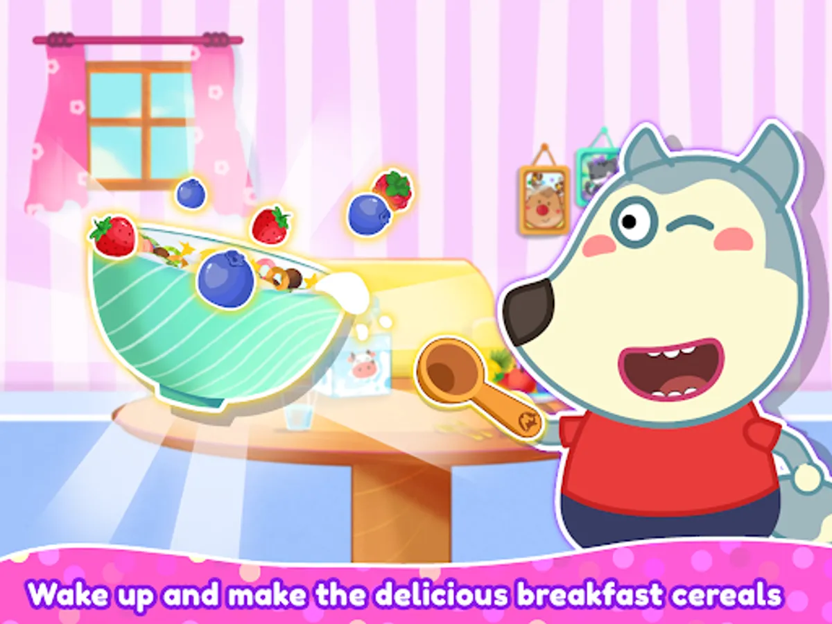 Help Wolfoo clean his teeth - Cook a delicious breakfast with cereal - Clean up the room - Feed the fish